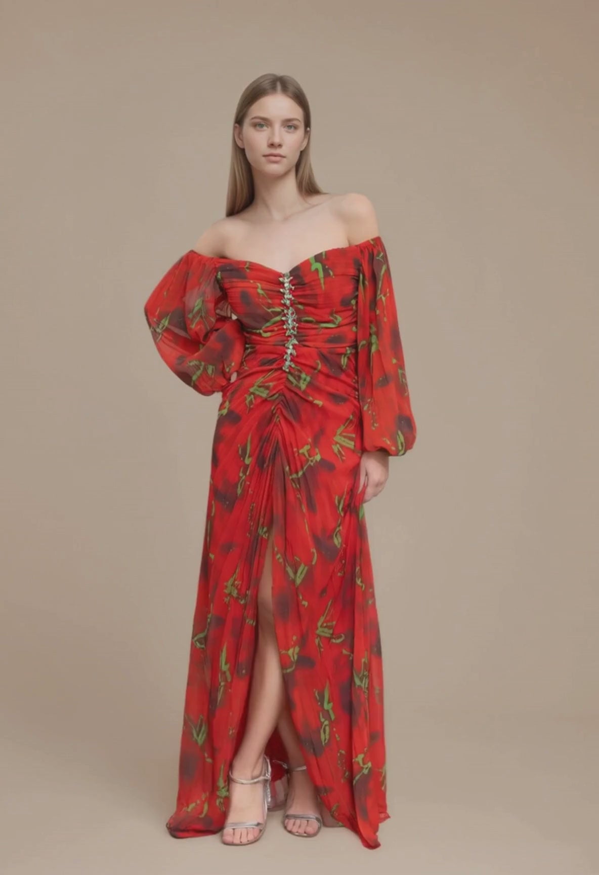 Cette robe de soirée en satin stretch met en valeur la silhouette avec un décolleté en V, des épaules structurées ornées de strass et des manches en tulle transparent. Le drapé croisé à la taille et la longue jupe fendue allongent la ligne pour...
