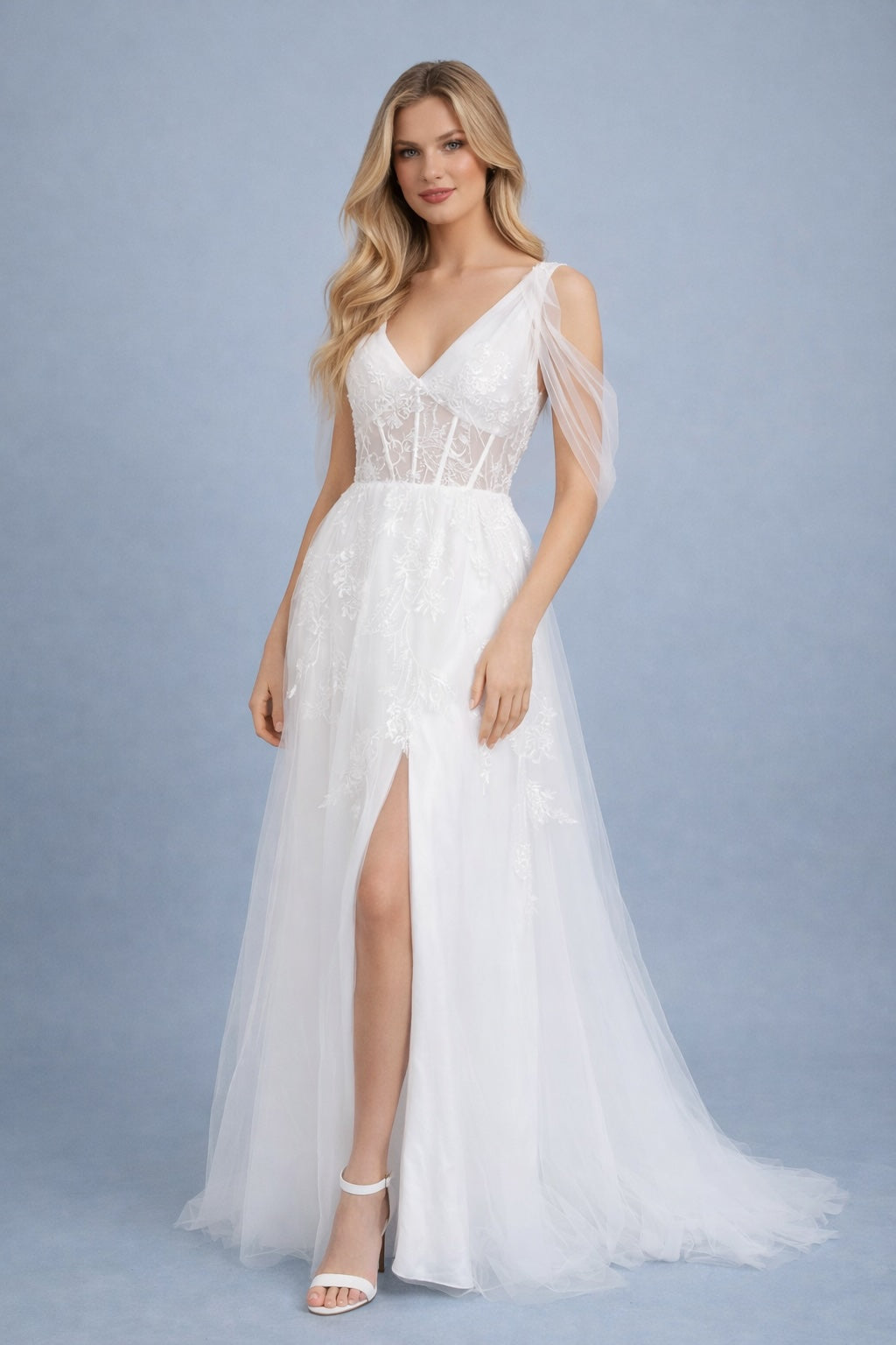 Cette robe de mariage combinent un décolleté V et un corsage illusion effet corset qui souligne la taille grâce aux lignes de baleines. La dentelle florale rehausse le buste et la jupe, tandis que les manches en tulle drapé apportent une touche aérienne. La fente devant et la jupe A-line fluide avec traîne créent une allure moderne, raffinée et très photogénique.