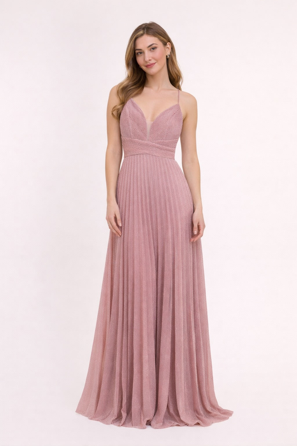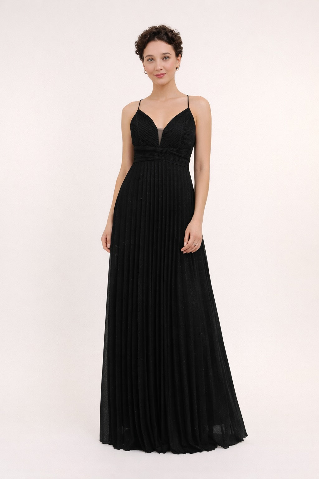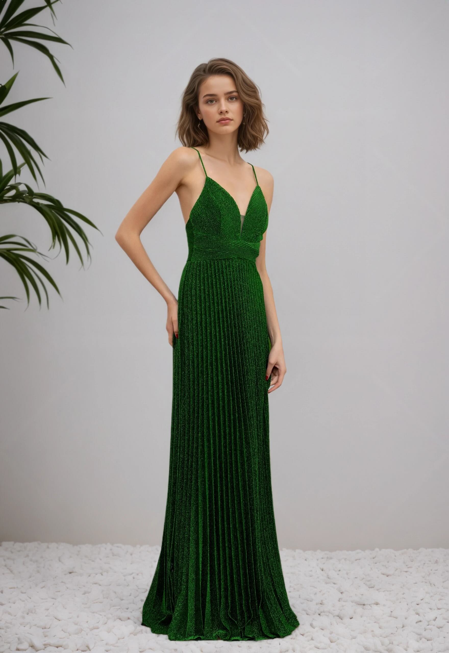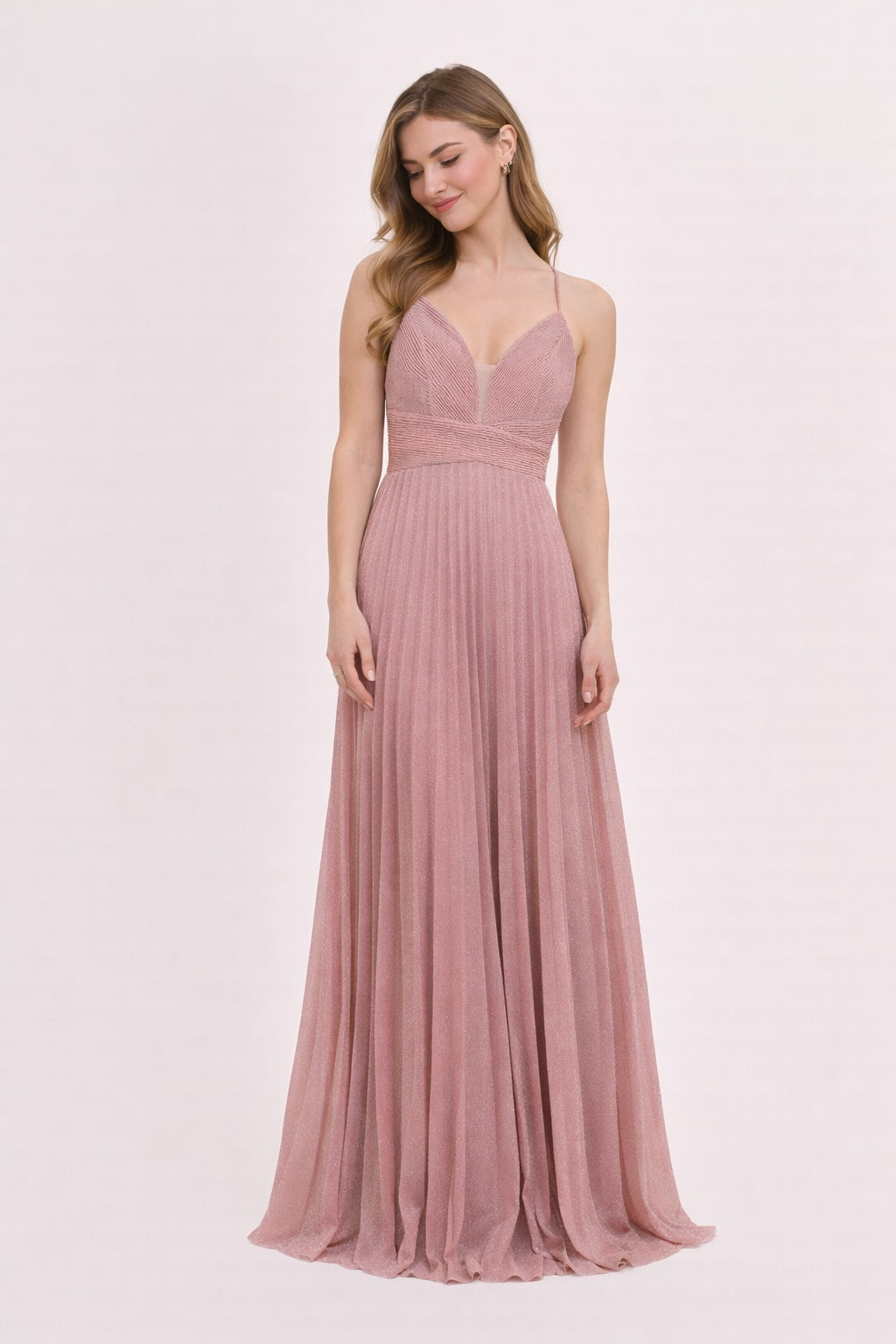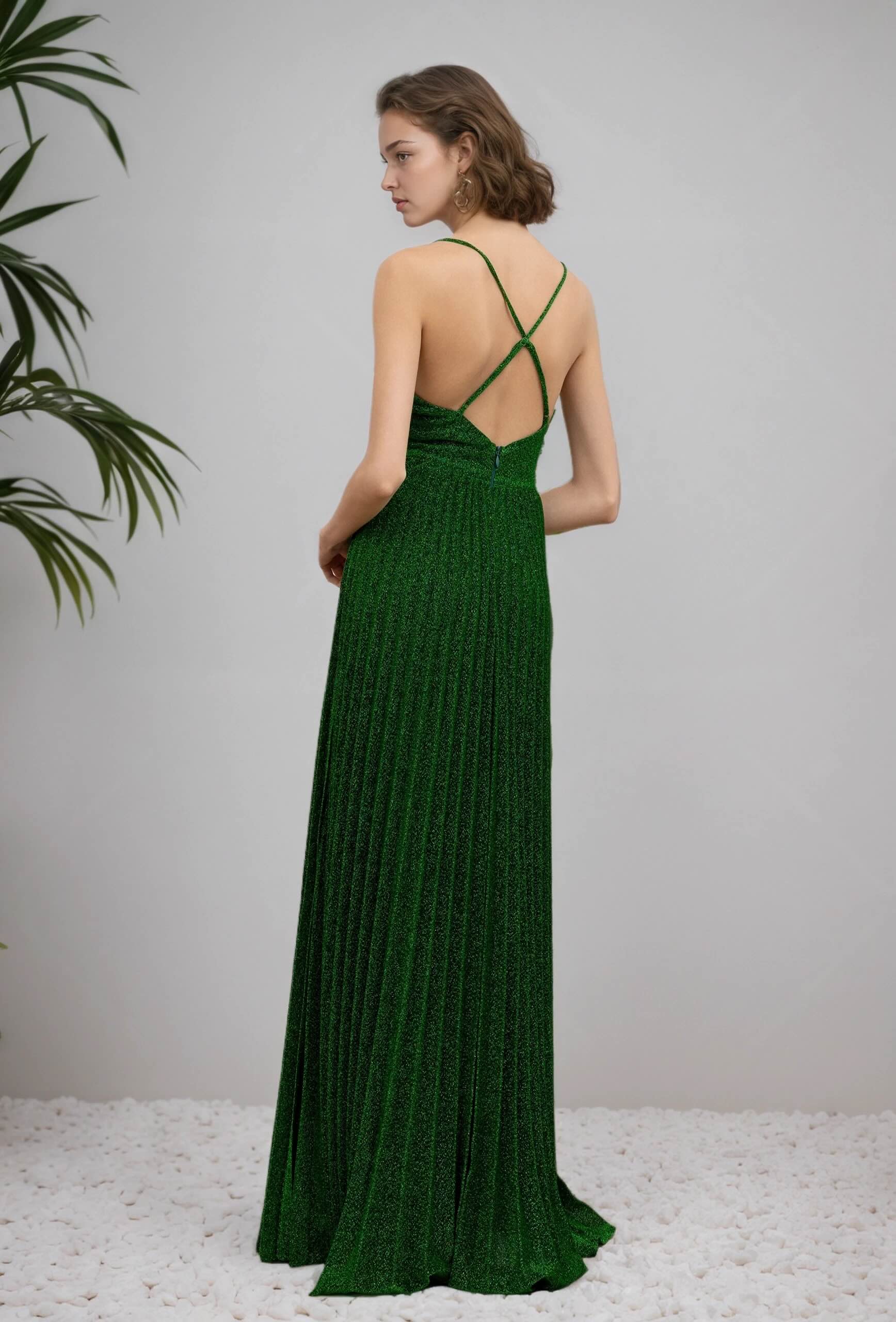 Cette Robes de soirée mise sur un tissu scintillant et un plissé fin pour un rendu lumineux très chic. Le décolleté V est sécurisé par un insert en tulle, la taille est soulignée par une bande structurée, puis la jupe maxi plissée tombe avec fluidité. Le dos croisé apporte une touche sensuelle mais élégante, parfaite pour cocktail, gala et invitée de mariage.
