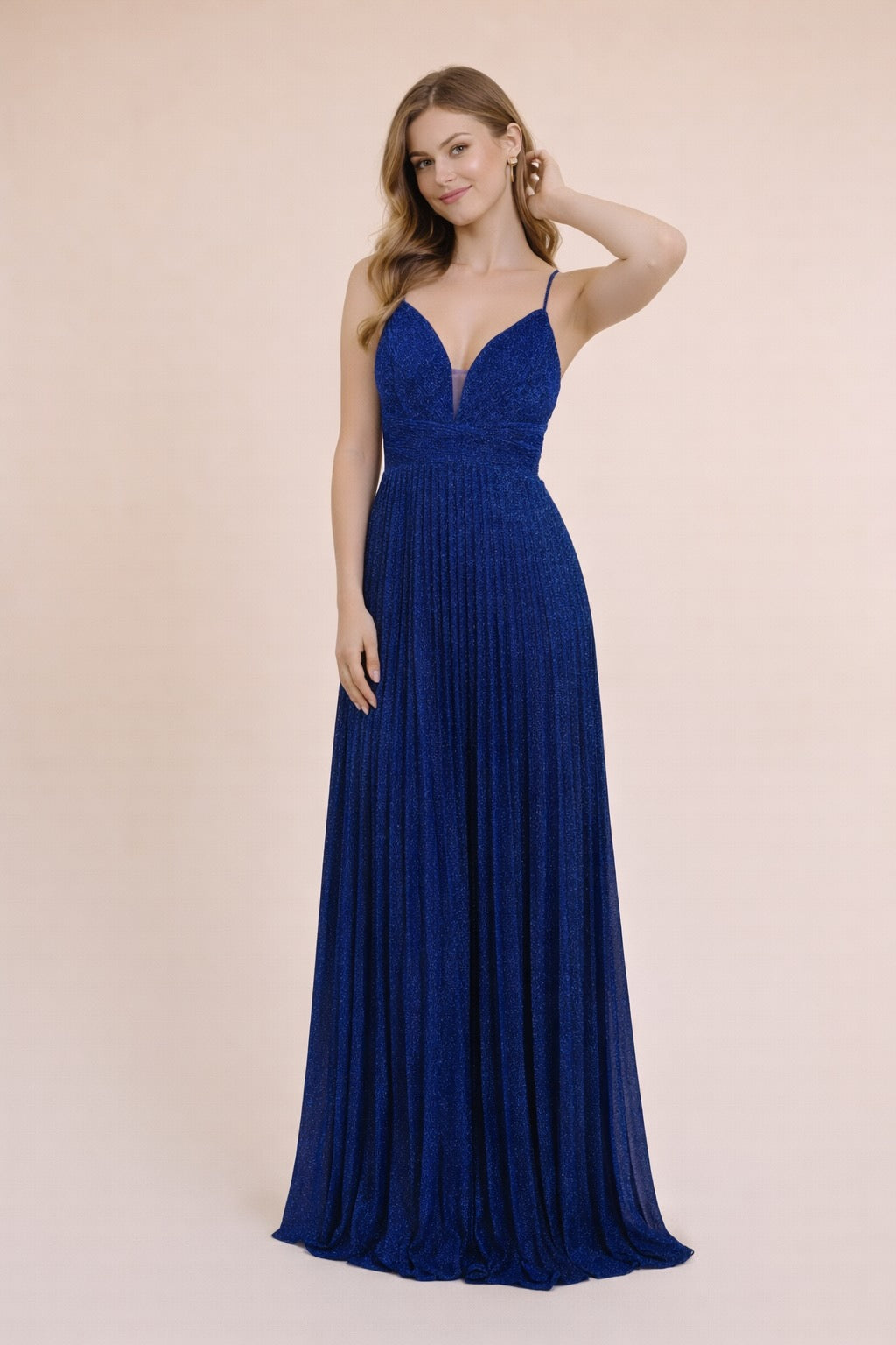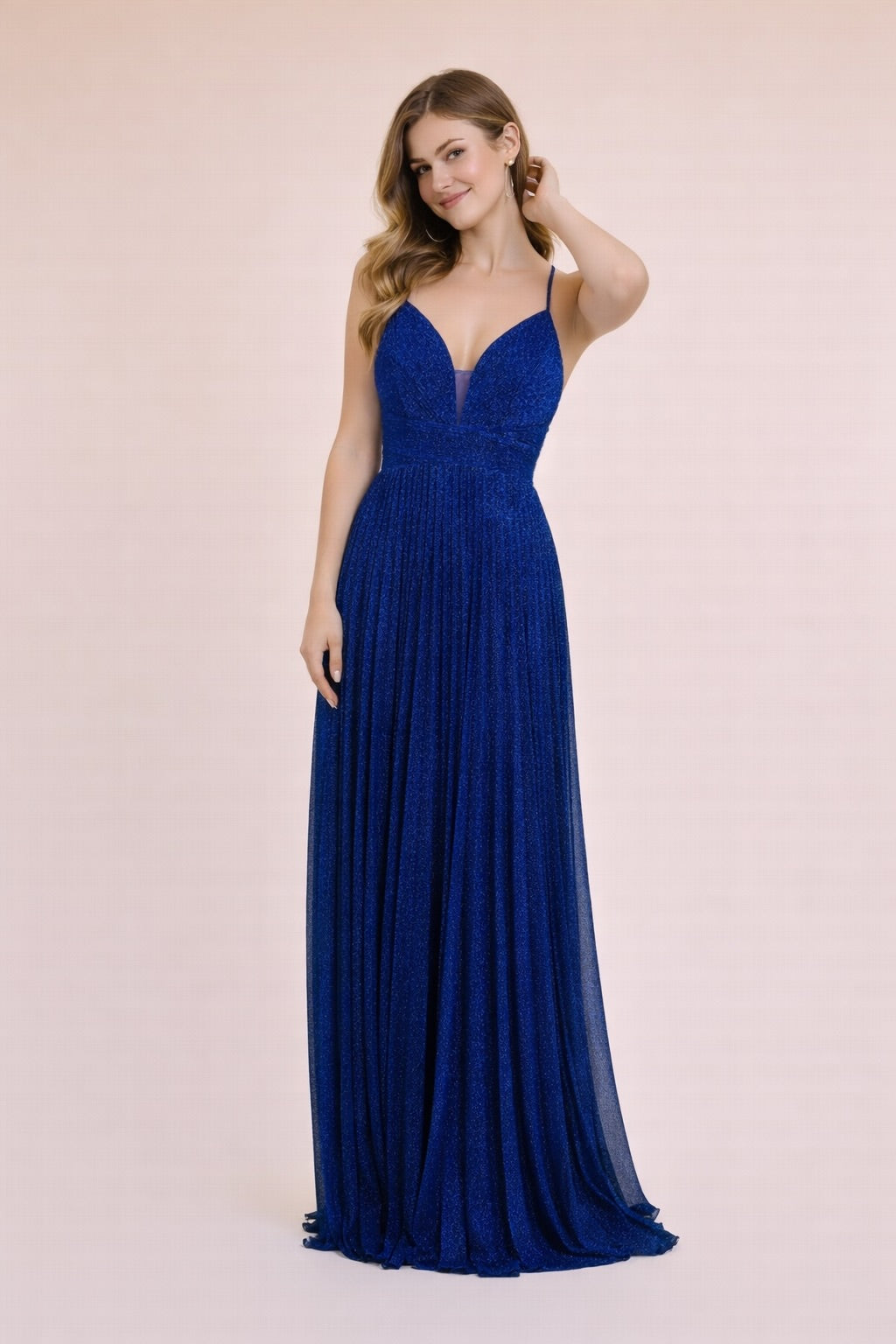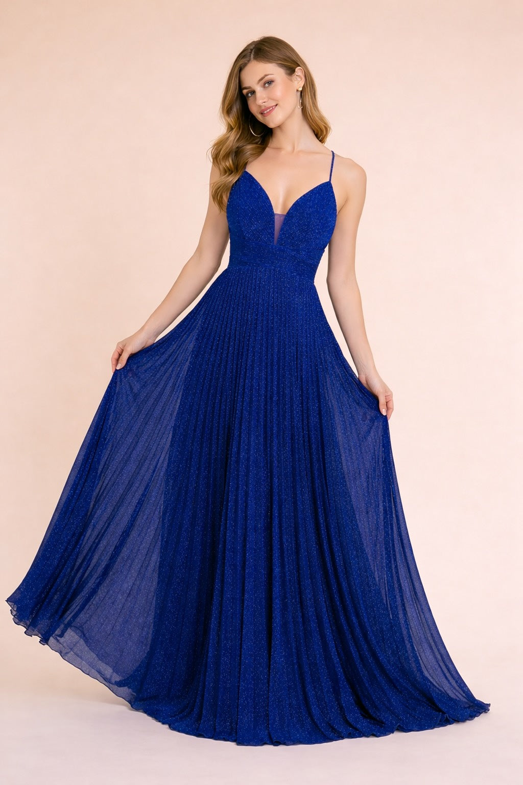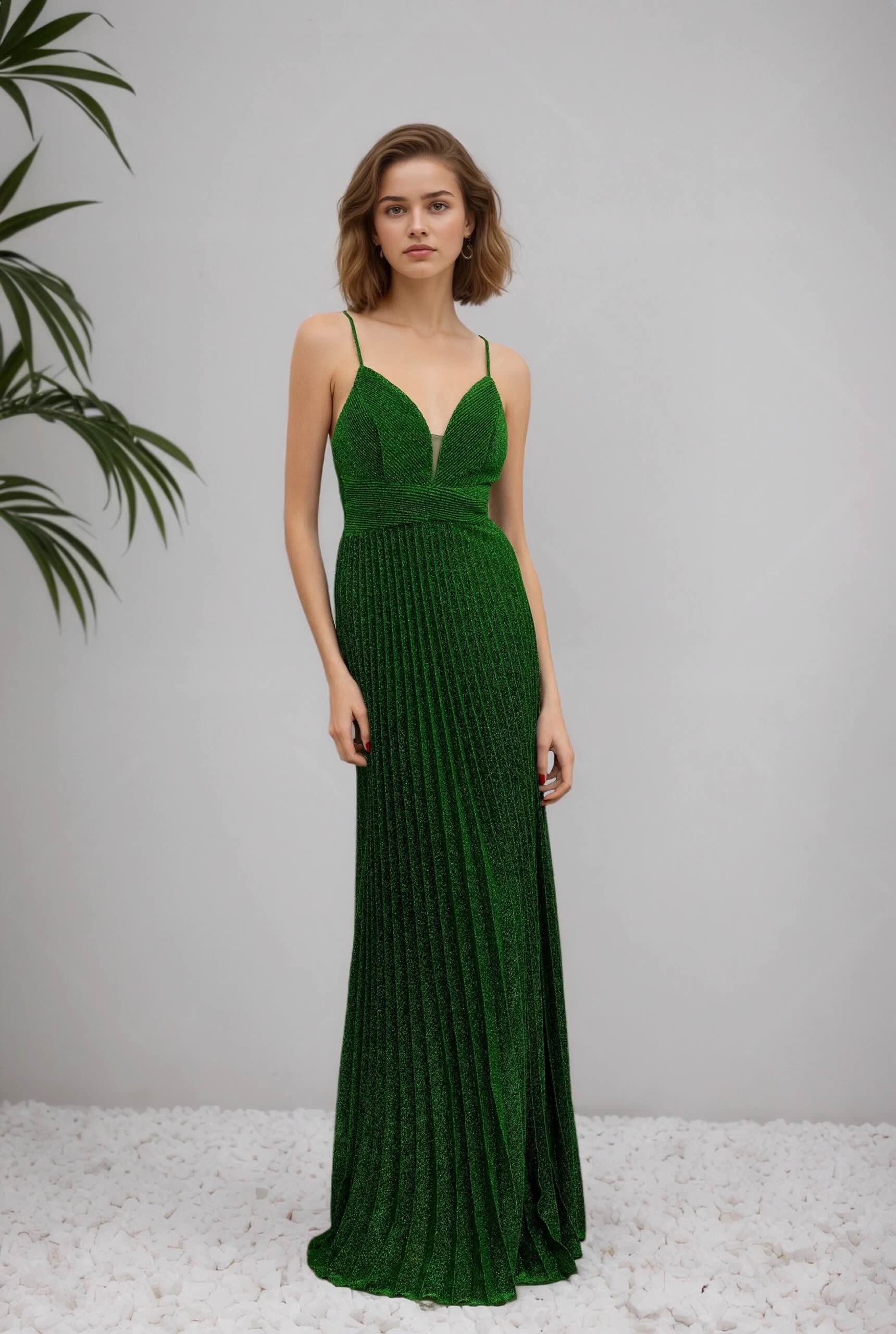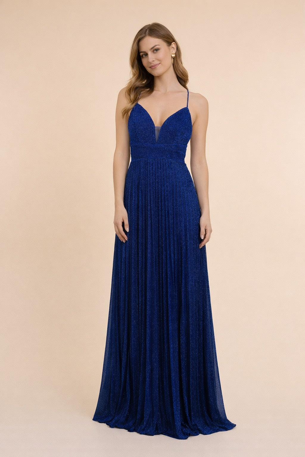 Cette Robes de soirée mise sur un tissu scintillant et un plissé fin pour un rendu lumineux très chic. Le décolleté V est sécurisé par un insert en tulle, la taille est soulignée par une bande structurée, puis la jupe maxi plissée tombe avec fluidité. Le dos croisé apporte une touche sensuelle mais élégante, parfaite pour cocktail, gala et invitée de mariage.