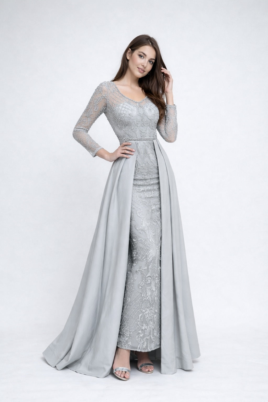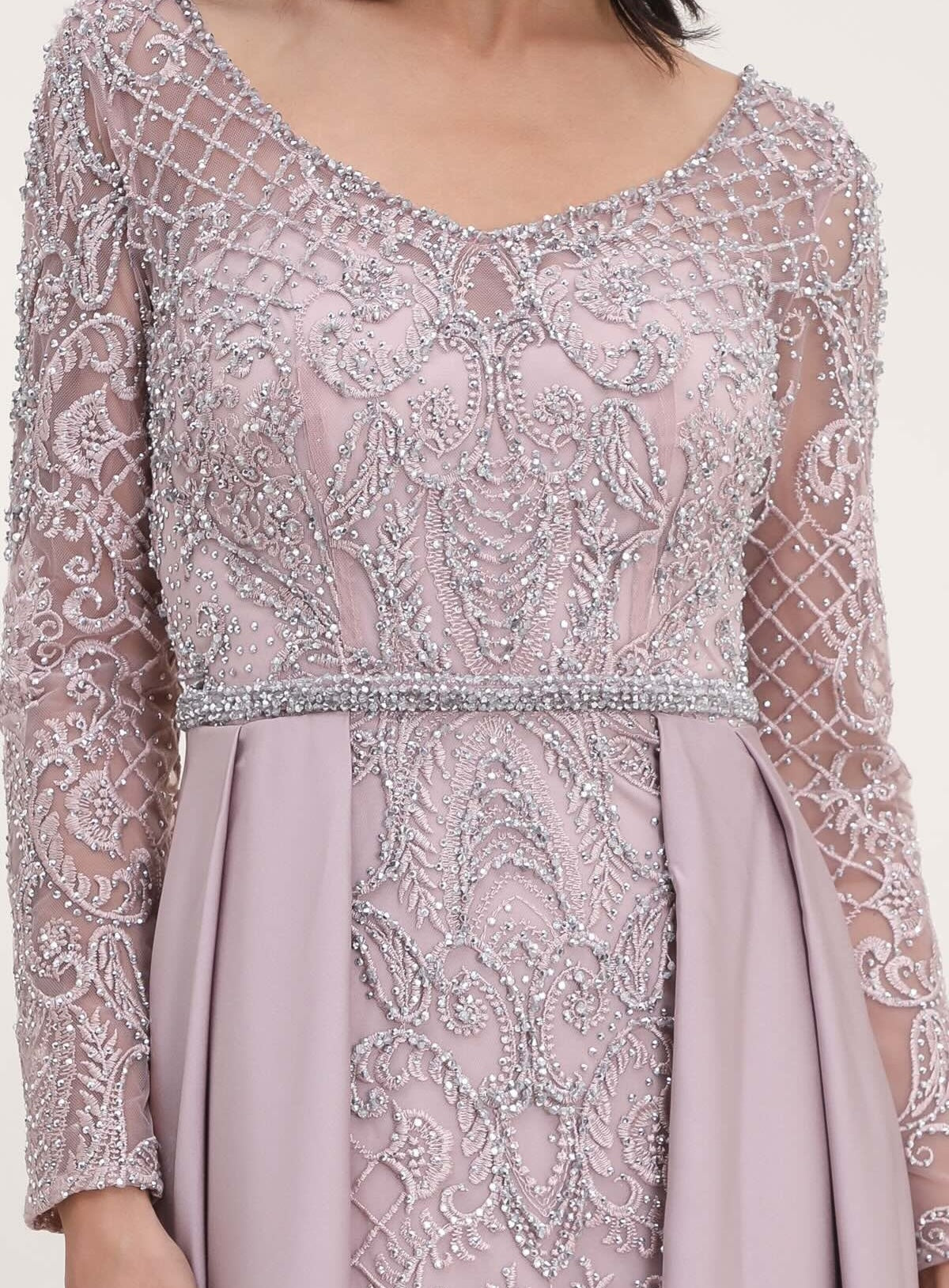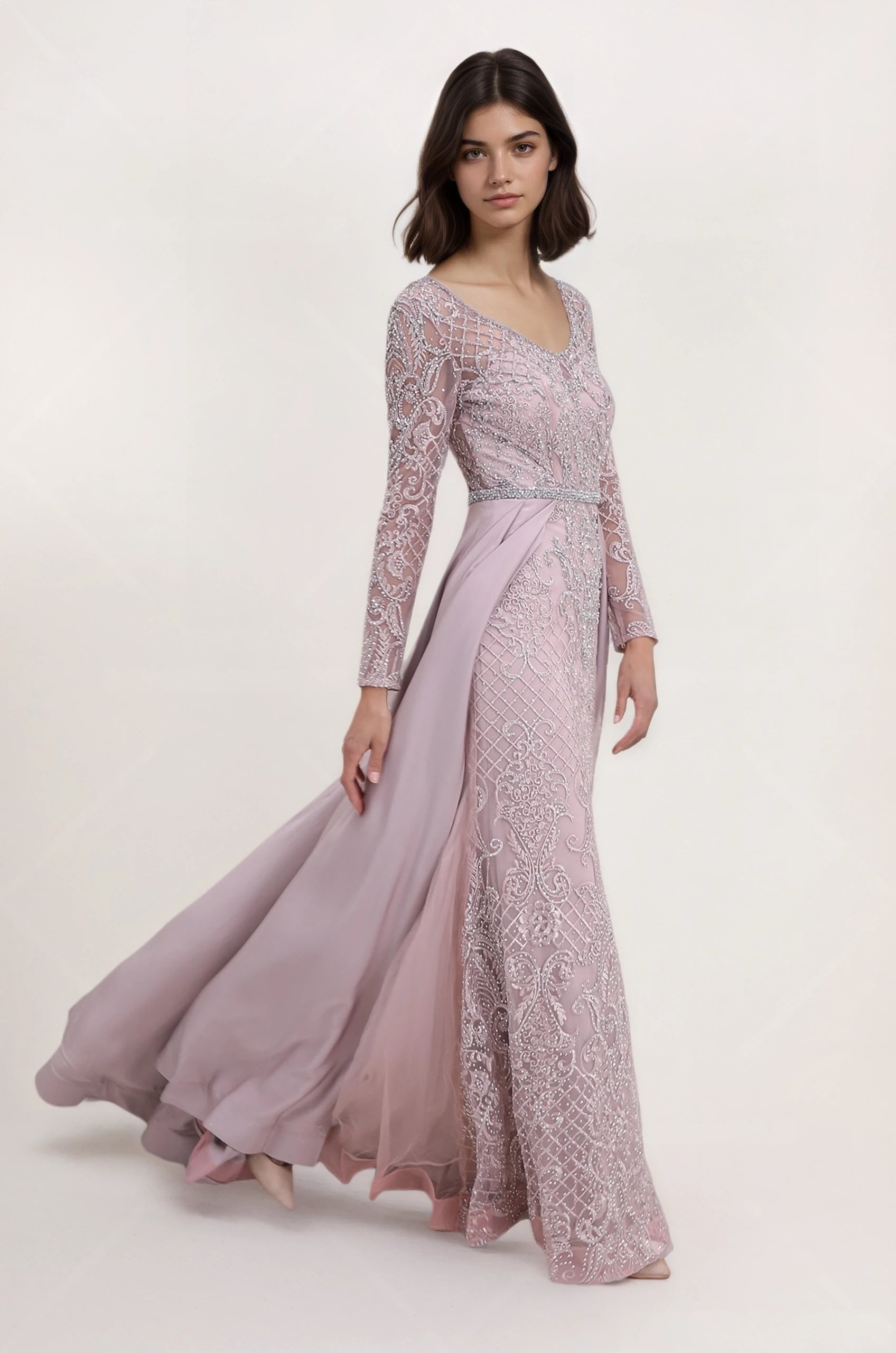 Cette robe de soirée associe un haut en tulle brodé perlé à manches longues et une robe longue près du corps. Le décolleté V allonge le buste, la ceinture bijoux marque joliment la taille, et les pans drapés sur les côtés créent une allure de cérémonie tout en flattant la silhouette, idéale pour les photos.