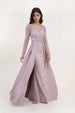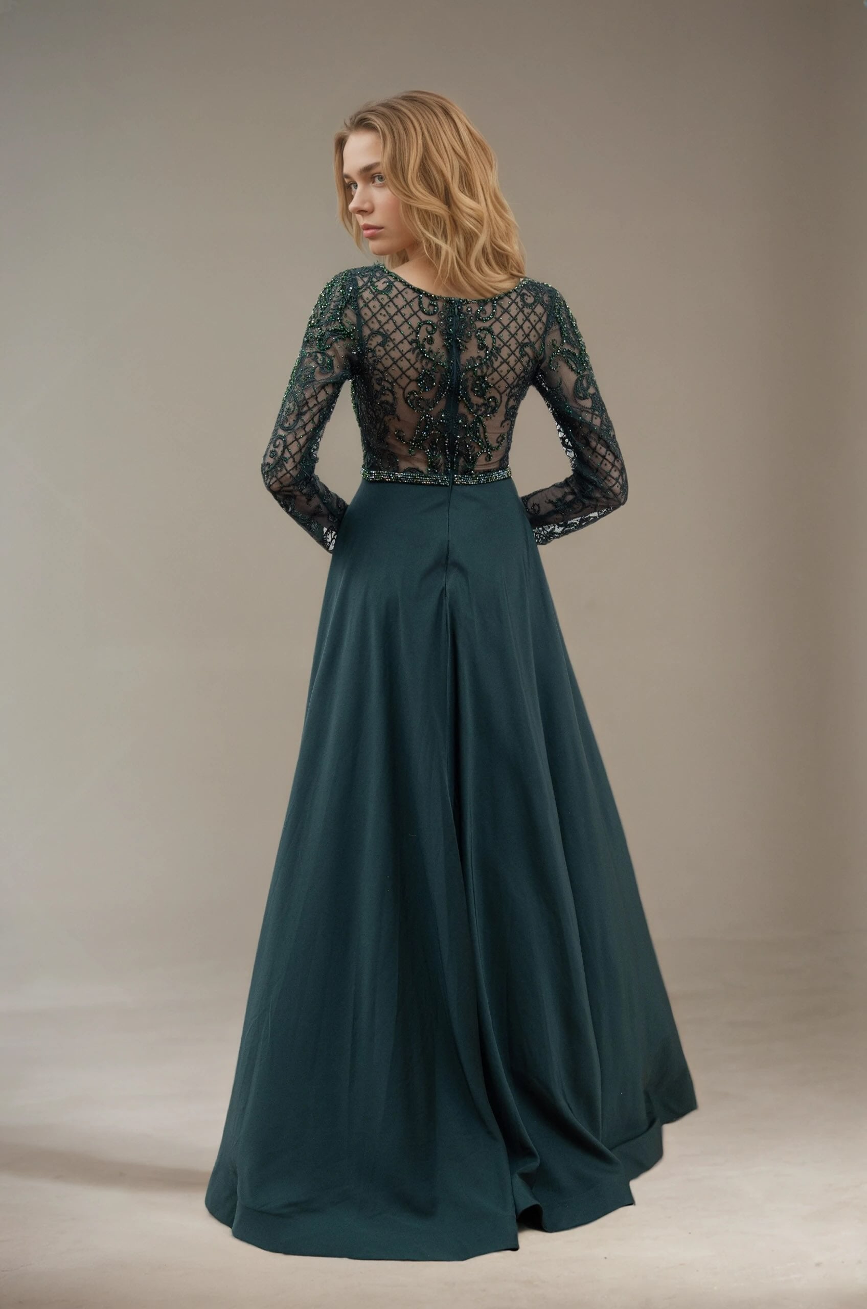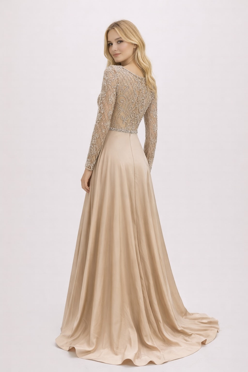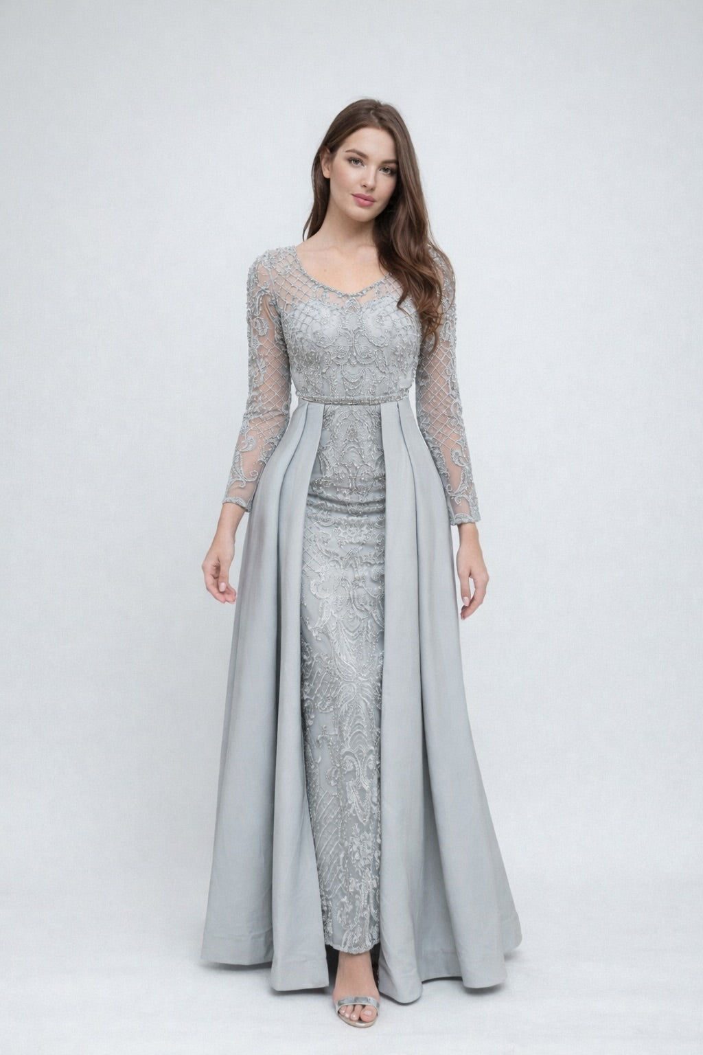 Cette robe de soirée associe un haut en tulle brodé perlé à manches longues et une robe longue près du corps. Le décolleté V allonge le buste, la ceinture bijoux marque joliment la taille, et les pans drapés sur les côtés créent une allure de cérémonie tout en flattant la silhouette, idéale pour les photos.