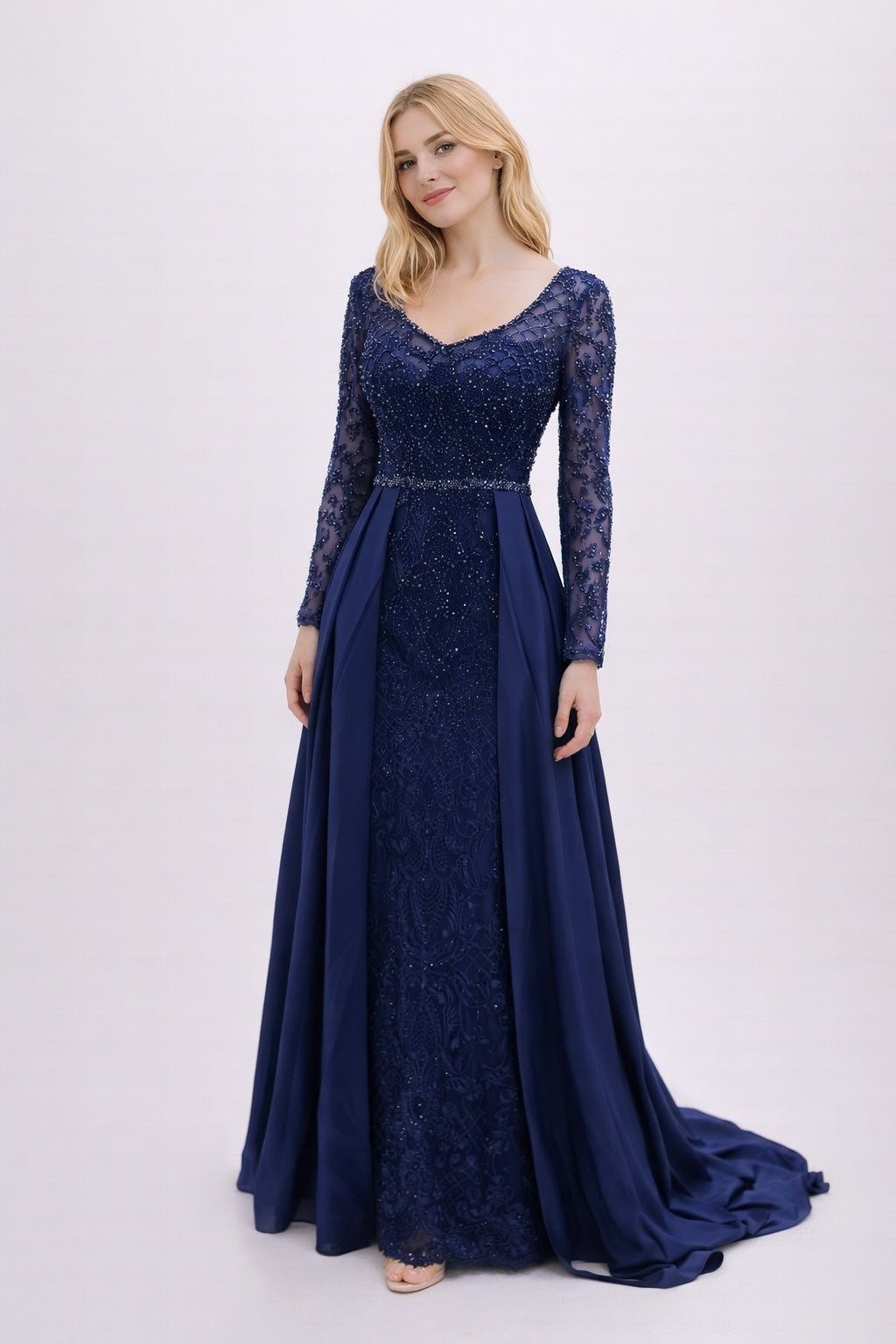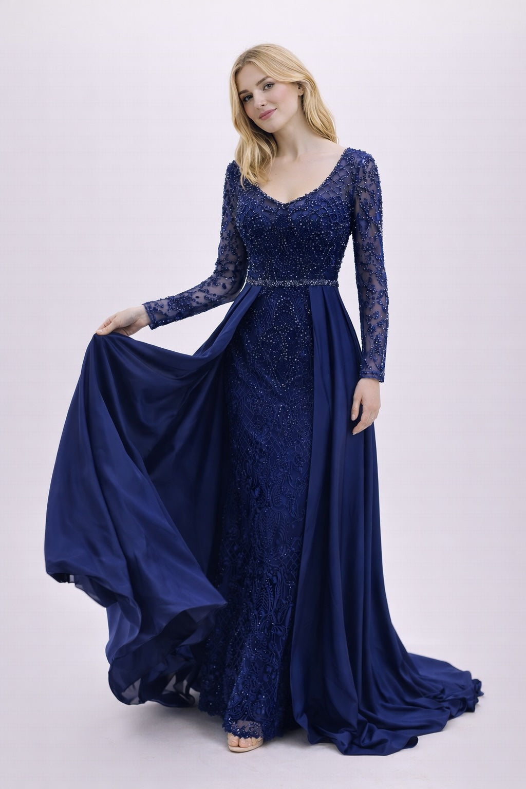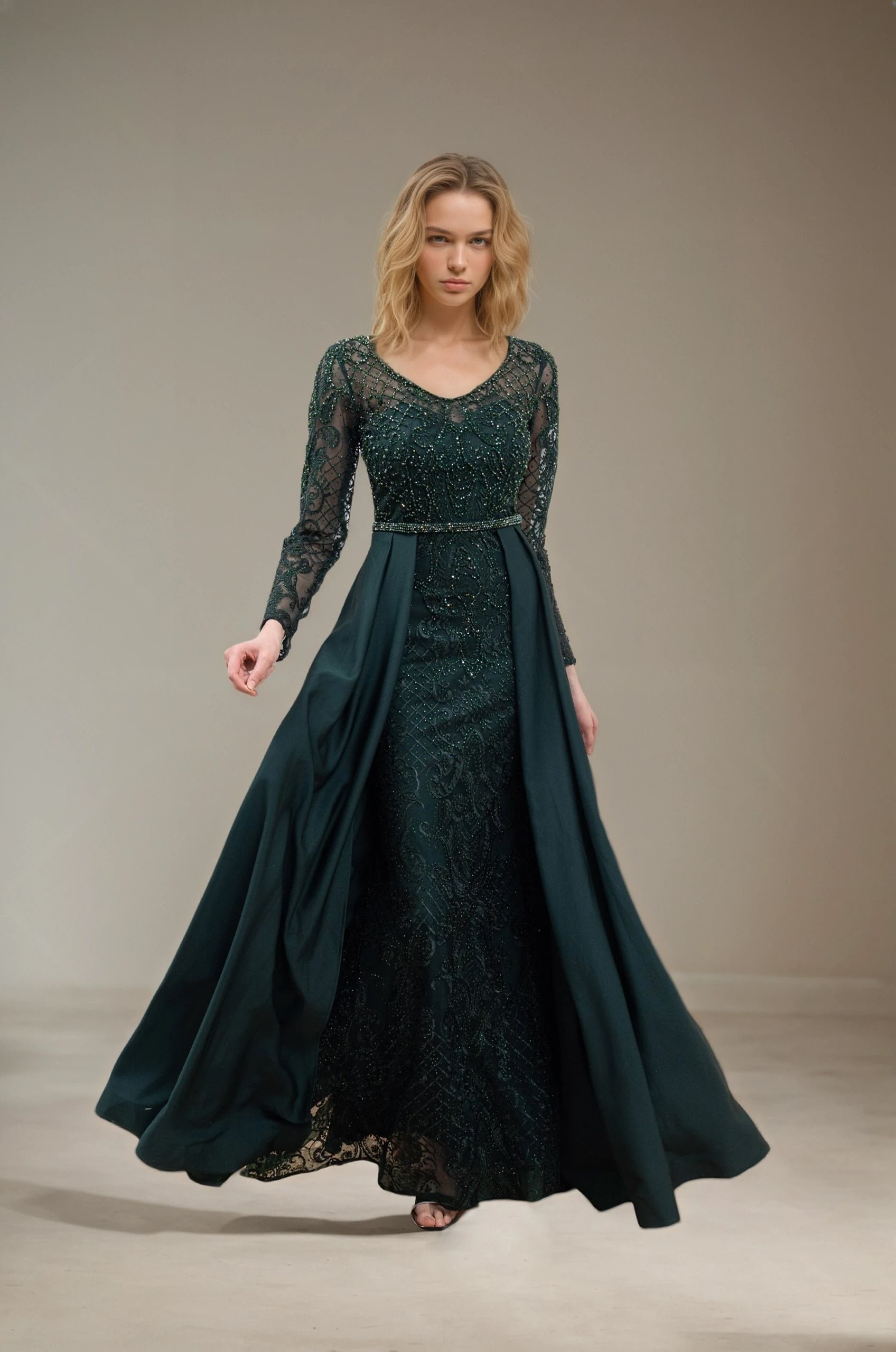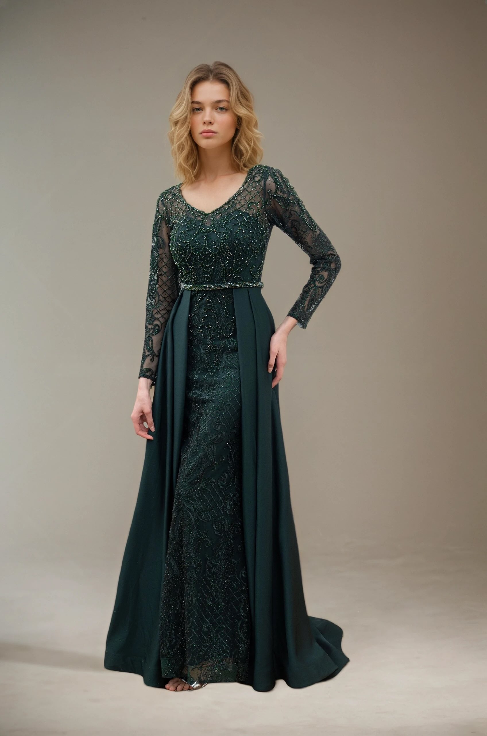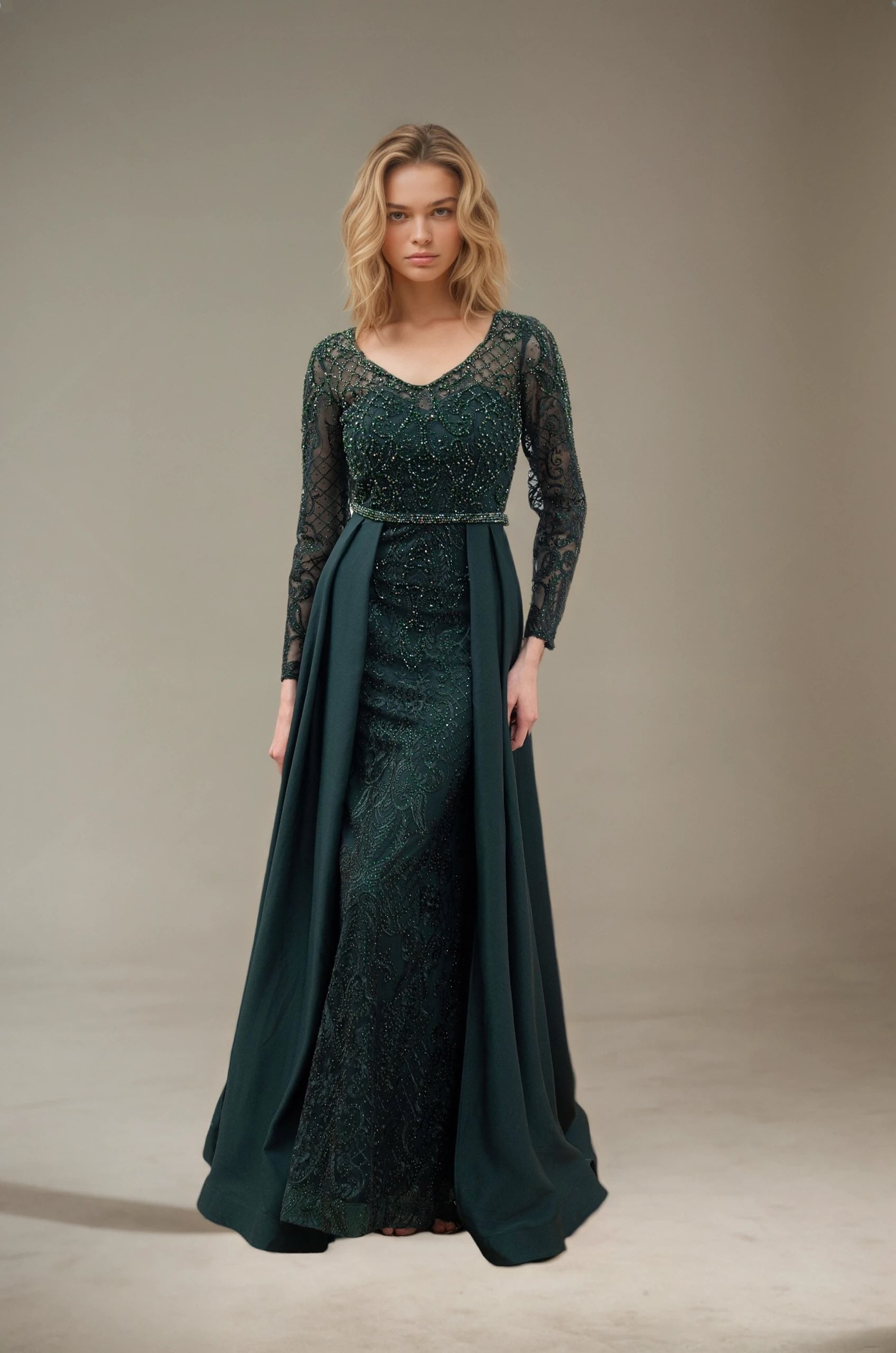 Femme Robe de soirée longue à manches longues en tulle brodé perlé décolleté V coupe gainante avec sur-jupe drapée sur les côtés | Dressie Dress