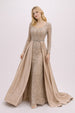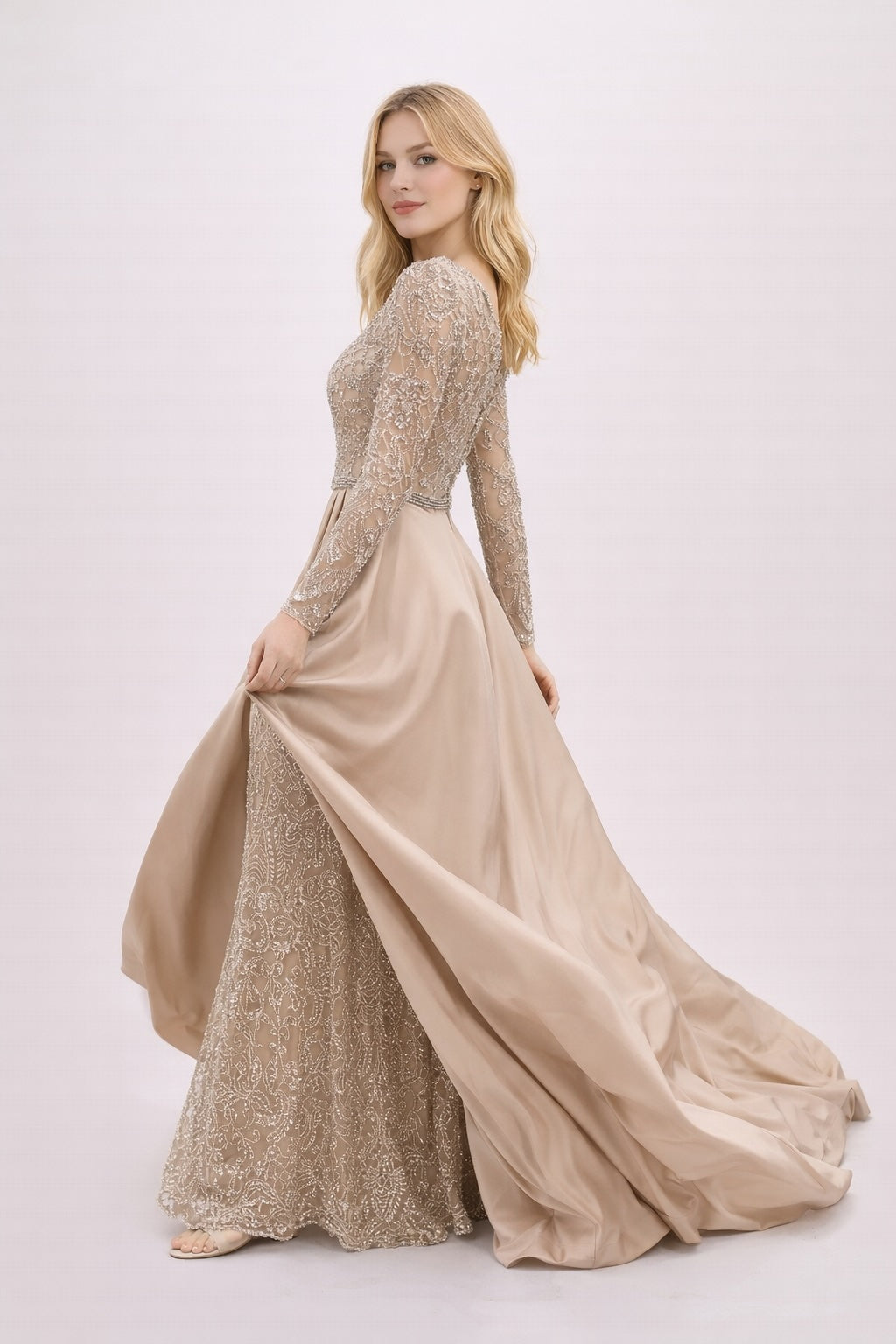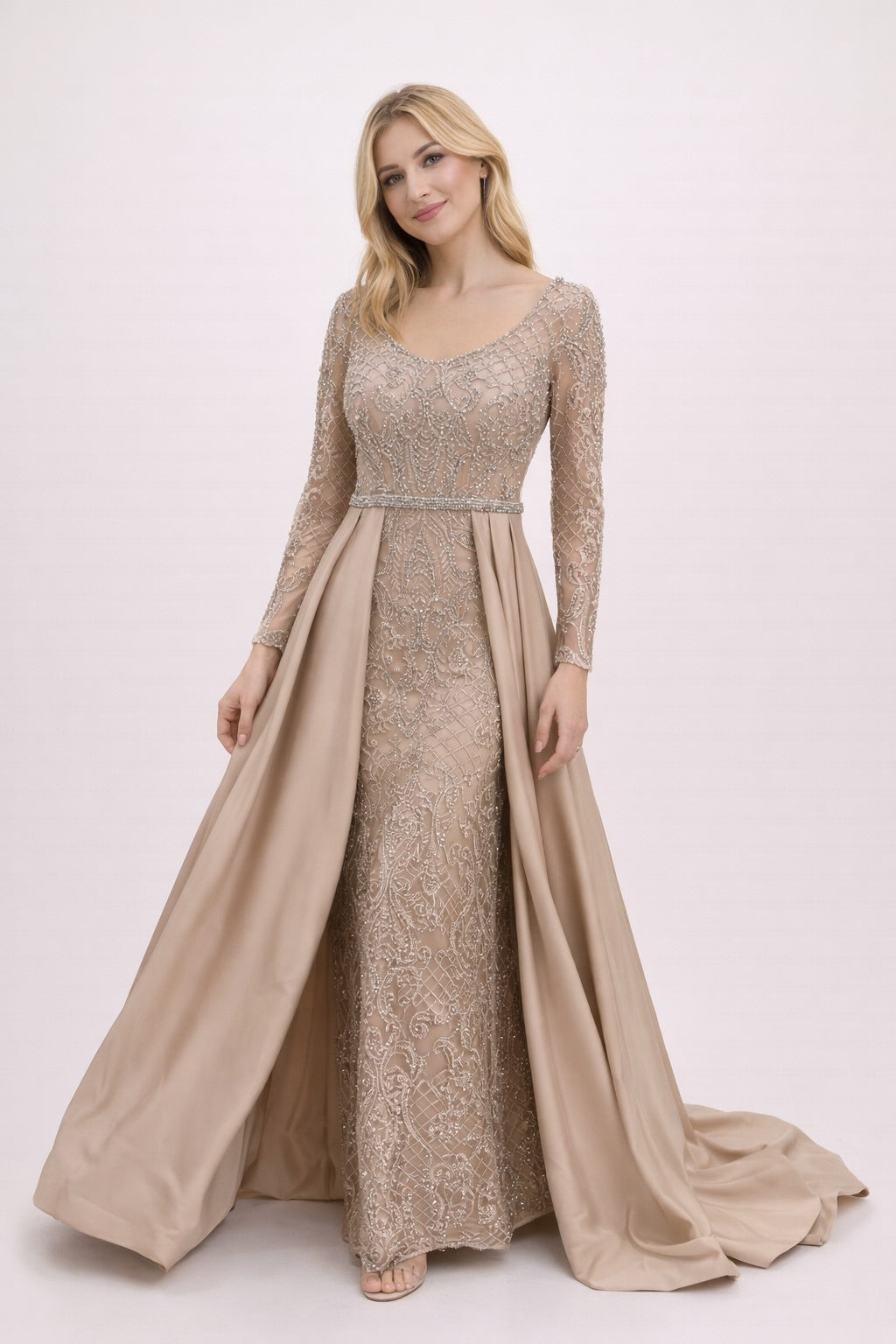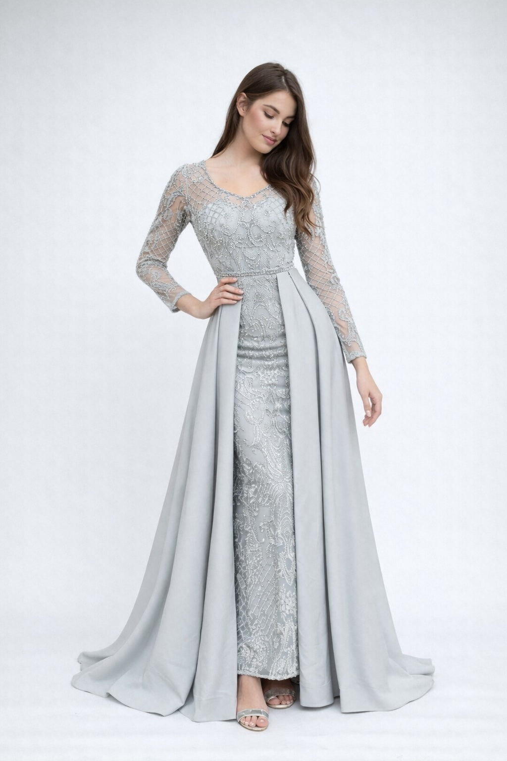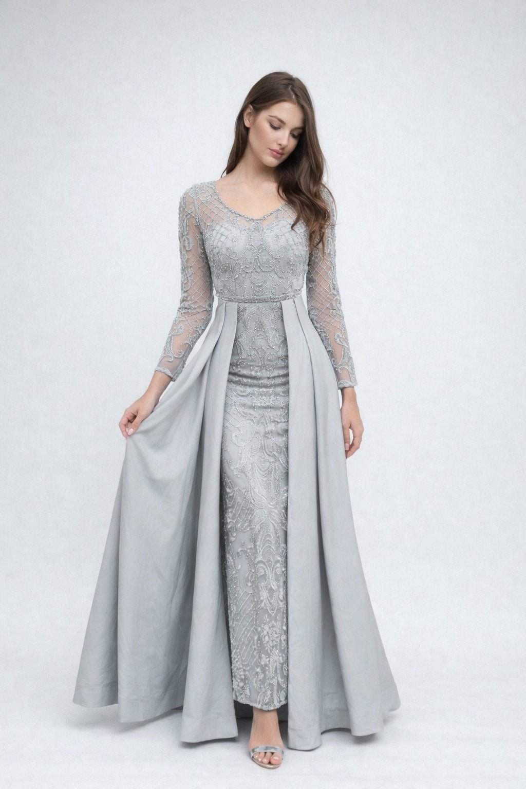 Femme Robe de soirée longue à manches longues en tulle brodé perlé décolleté V coupe gainante avec sur-jupe drapée sur les côtés | Dressie Dress