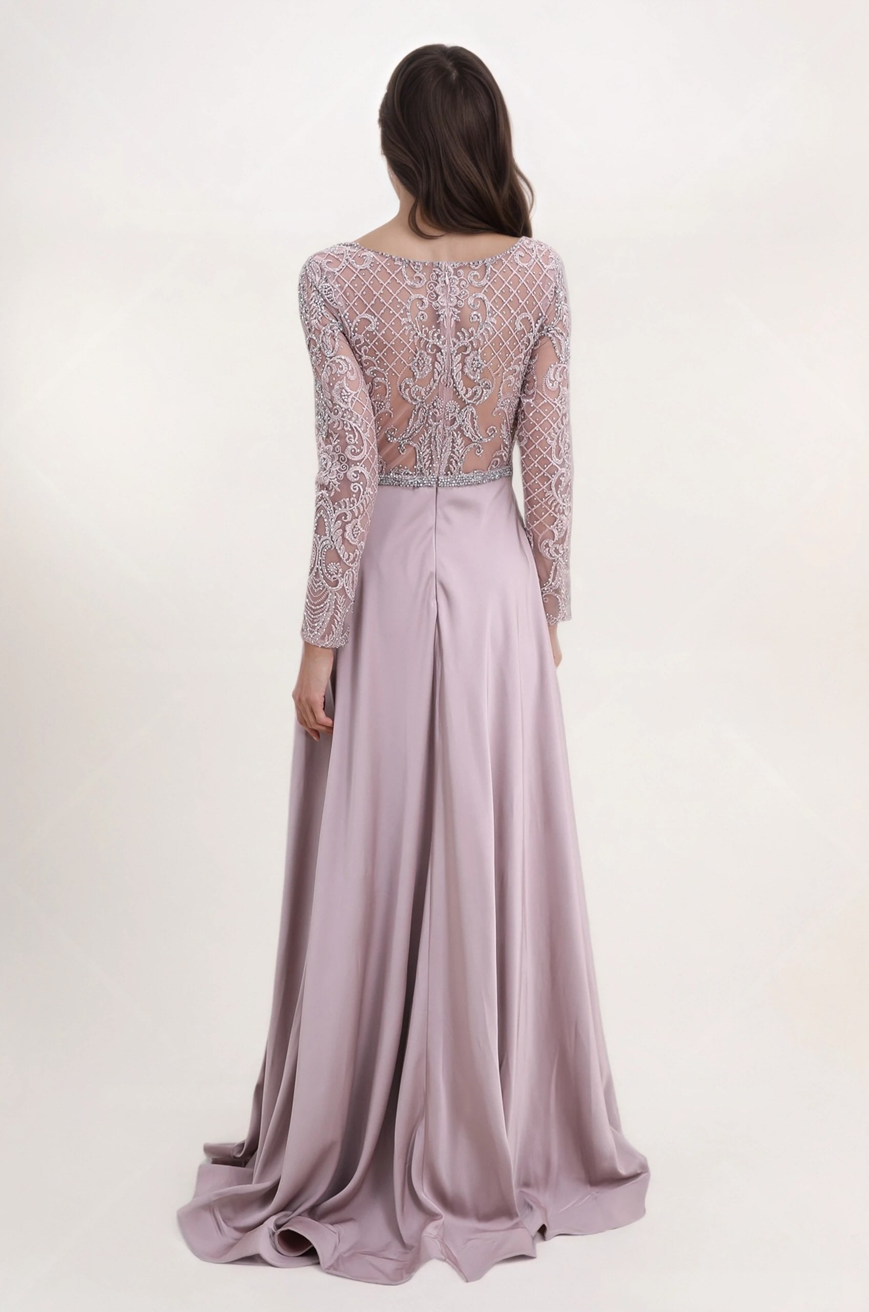 • Tulle illusion brodé et perlé : buste et manches en tulle fin, richement brodé et orné de perles/strass pour un rendu luxueux.