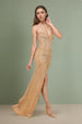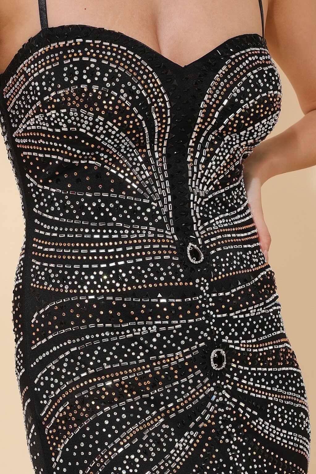Sweetheart neckline with delicate straps, rhinestone motifs in radiating lines visually sculpt the waist and enhance the silhouette. The front slit elongates the leg and creates a very "red carpet" look. A sparkling, crystalline dress, ideal for evenings and parties.