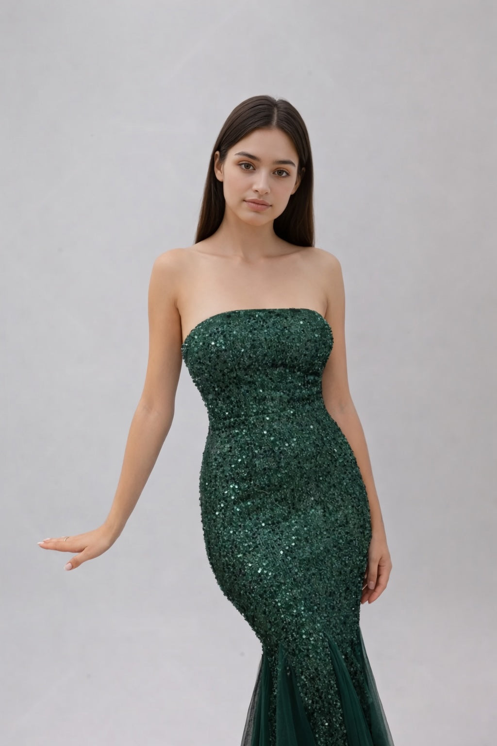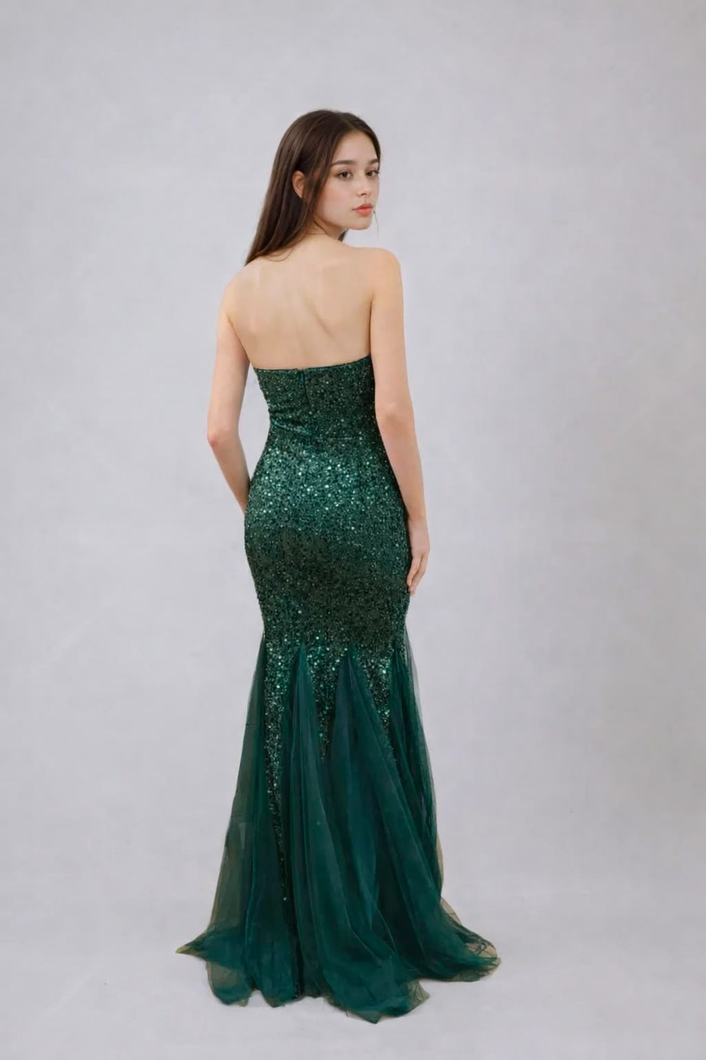 Cette Robes de soirée bustier à sequins mise sur un éclat ultra chic sous la lumière : encolure droite sans bretelles, taille et hanches gainées pour une silhouette sculptée, puis un bas sirène en tulle léger qui apporte du mouvement...