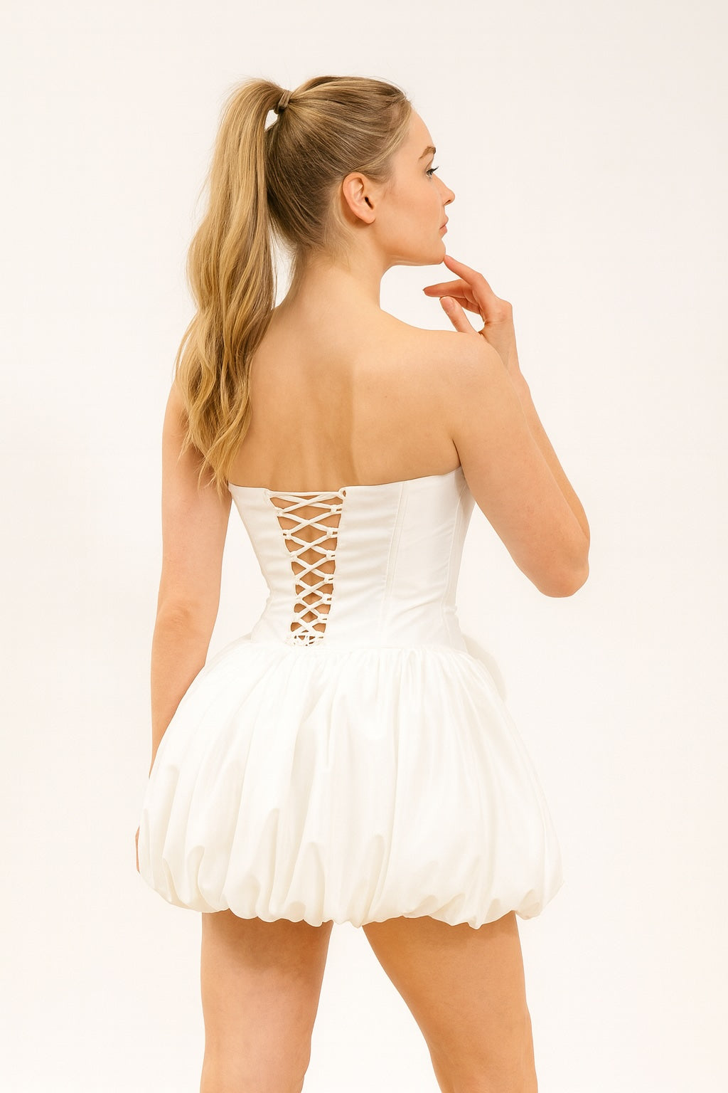 • Jupe courte boule créée par des plis rentrés, donnant un volume ludique qui affine visuellement les jambes.