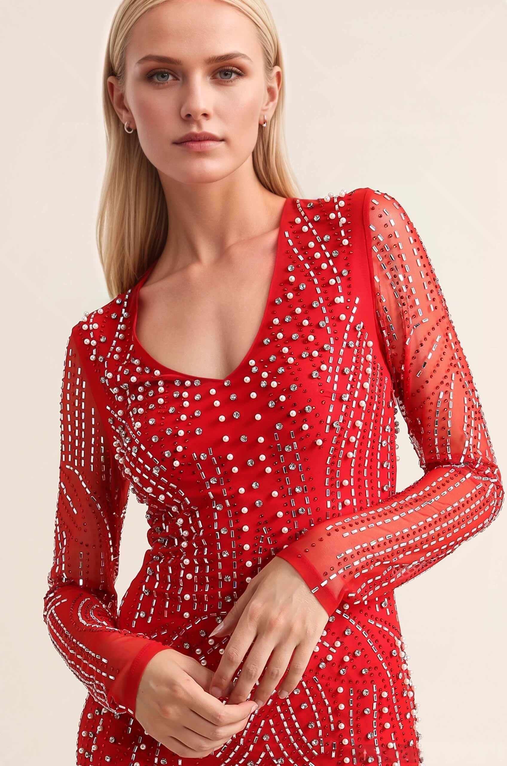 Cette Robe cristalline / brillante présente une coupe mini moulante à manches longues et encolure en V. Le corps est entièrement recouvert de strass et perles disposés en lignes fluides des épaules jusqu’à l’ourlet, créant un effet sculptant qui affine la taille et galbe les hanches. Le tissu extensible épouse les formes sans gêner les mouvements, avec une longueur au-dessus du genou parfaite pour les soirées, clubs, anniversaires et réveillons.