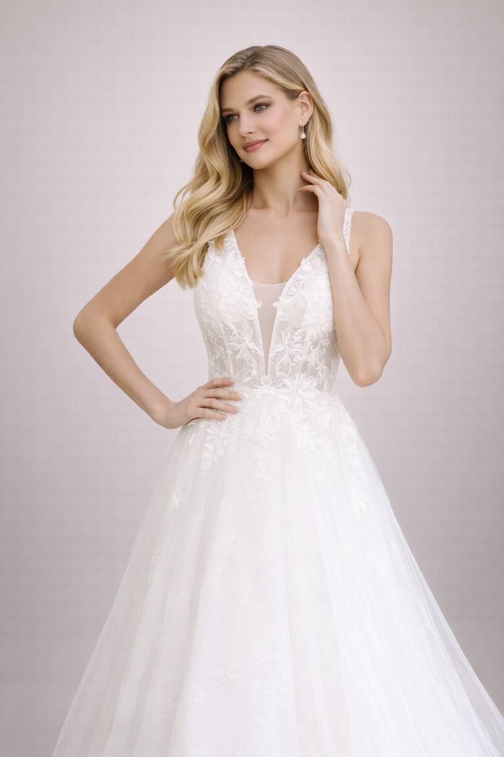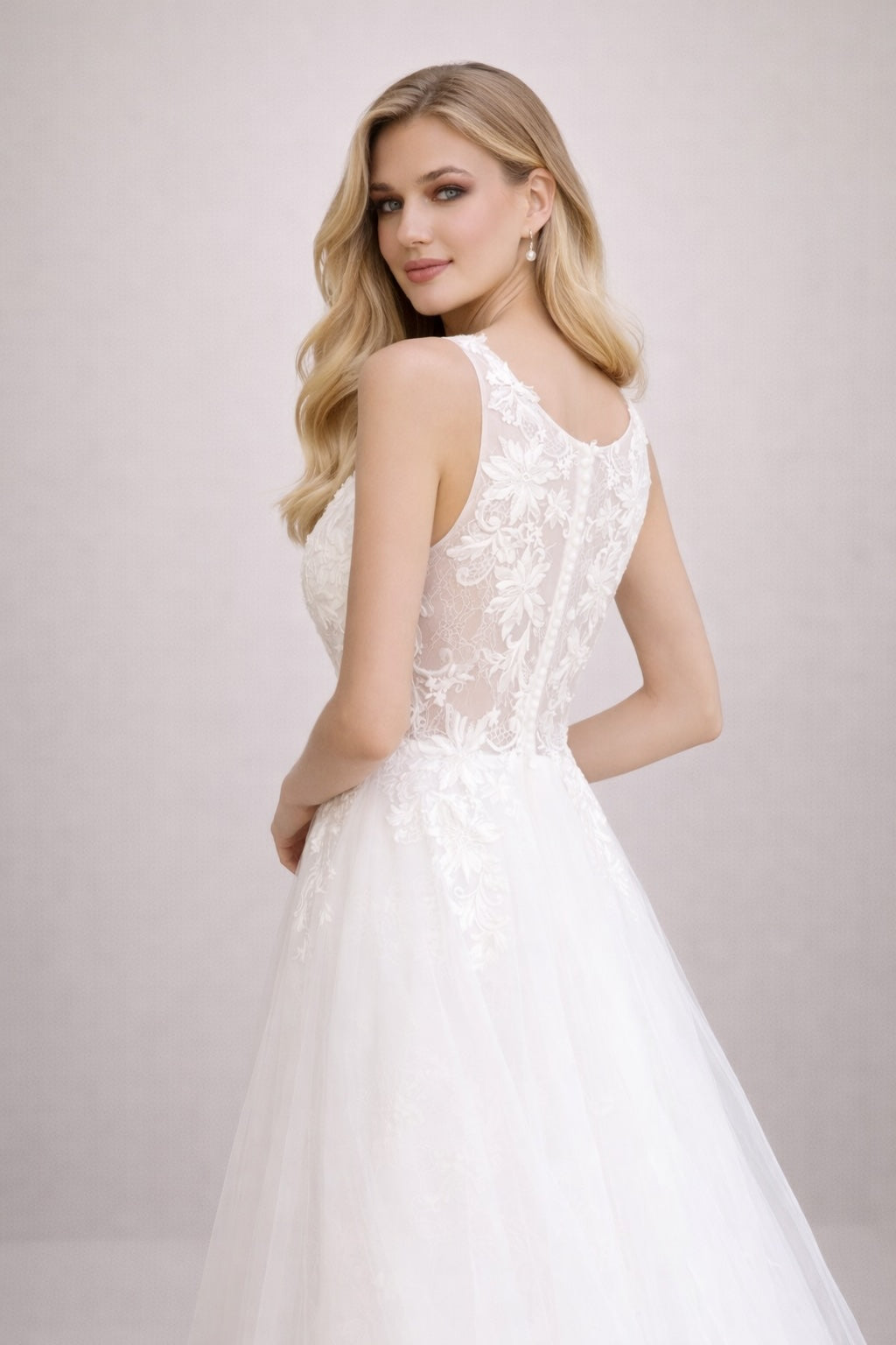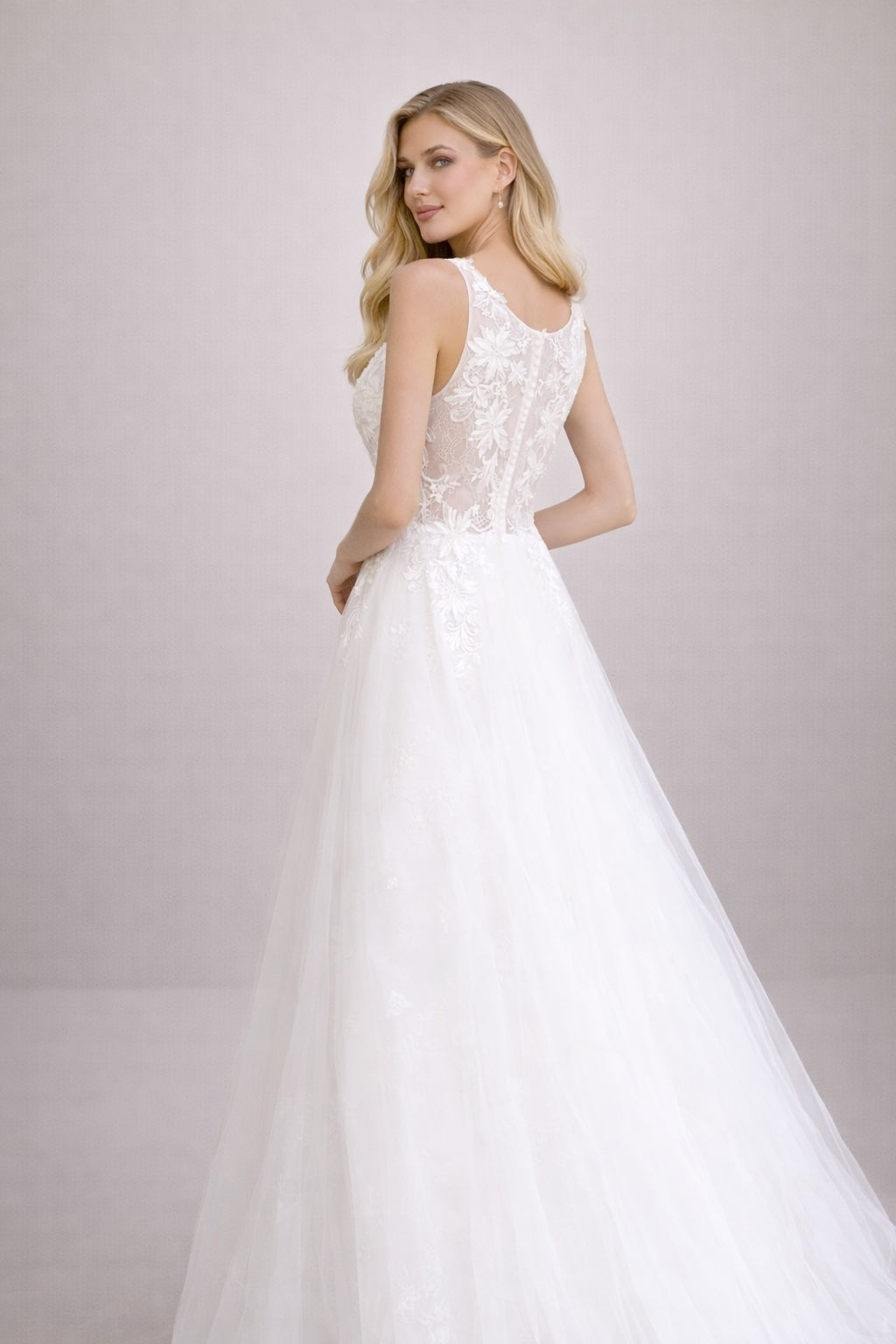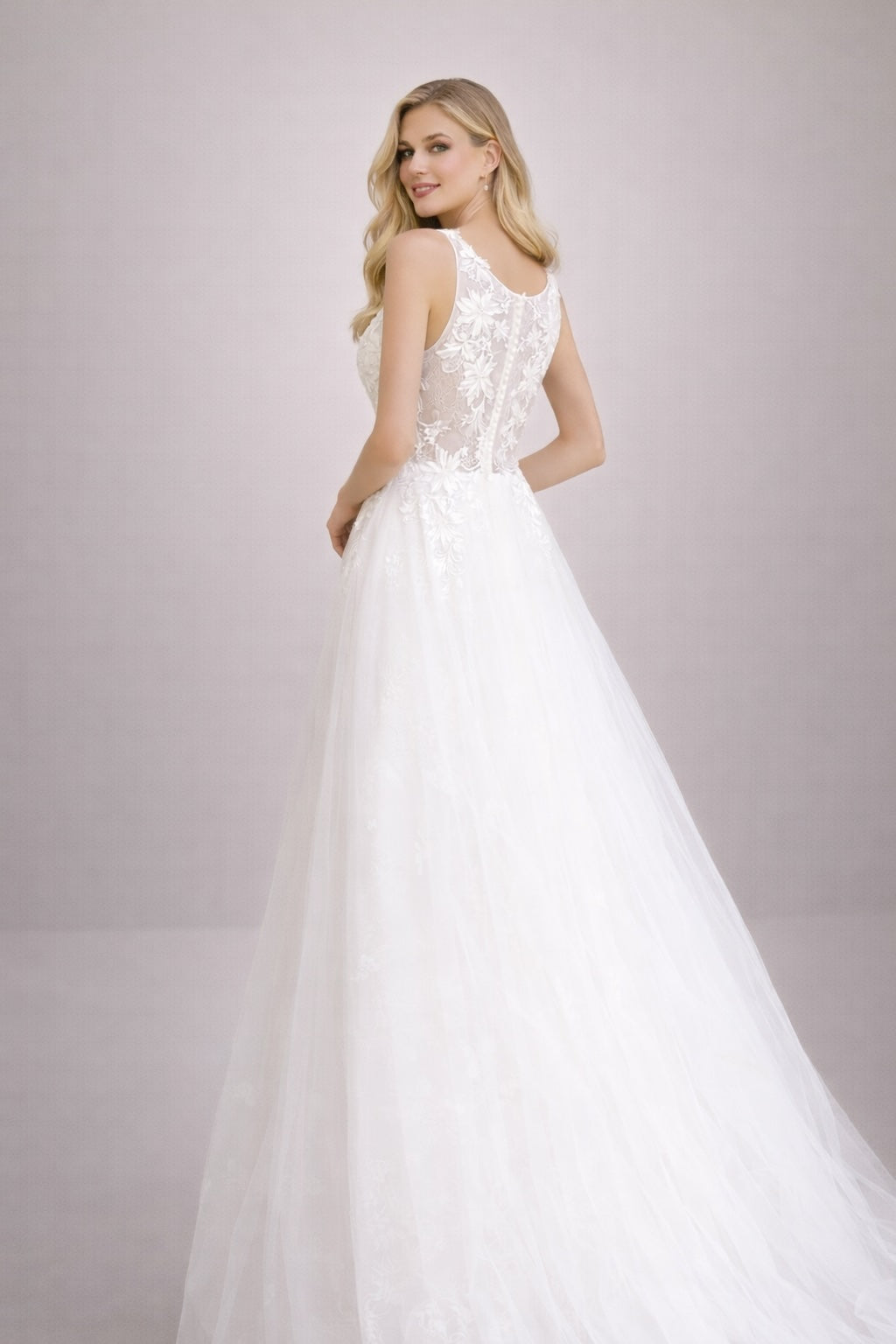 Cette robe de mariage associe un décolleté V illusion en tulle à de délicats appliqués floraux, une taille bien marquée et une jupe ample en tulle aérien. Le dos semi-transparent avec boutons apporte une finition couture, idéale pour un rendu élégant et photogénique.