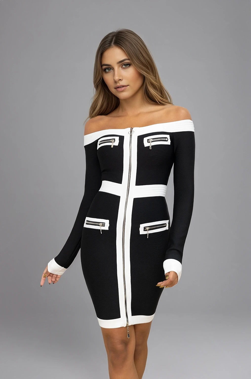 Cette Robe bandage à épaules dénudées et manches longues se distingue par un zip intégral sur le devant et des bandes contrastées qui structurent la taille et allongent la silhouette. Le tissu bandage épais et extensible épouse le corps, tandis que la longueur au-dessus du genou offre un équilibre parfait entre élégance et sensualité pour le bureau, le cocktail ou un rendez-vous chic.