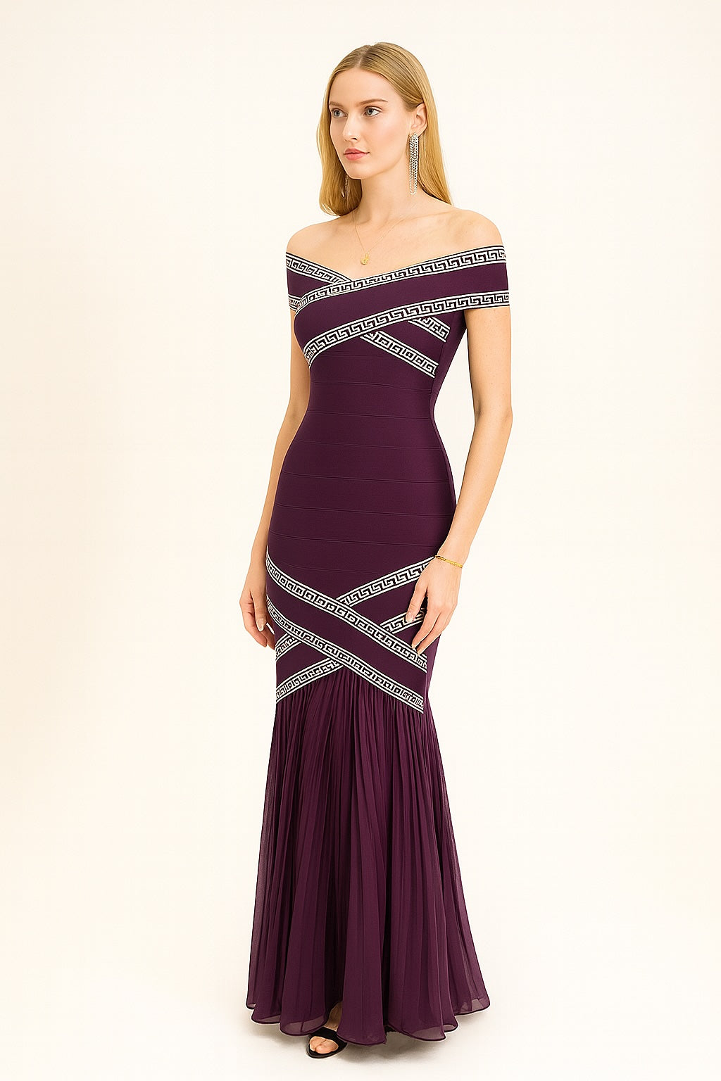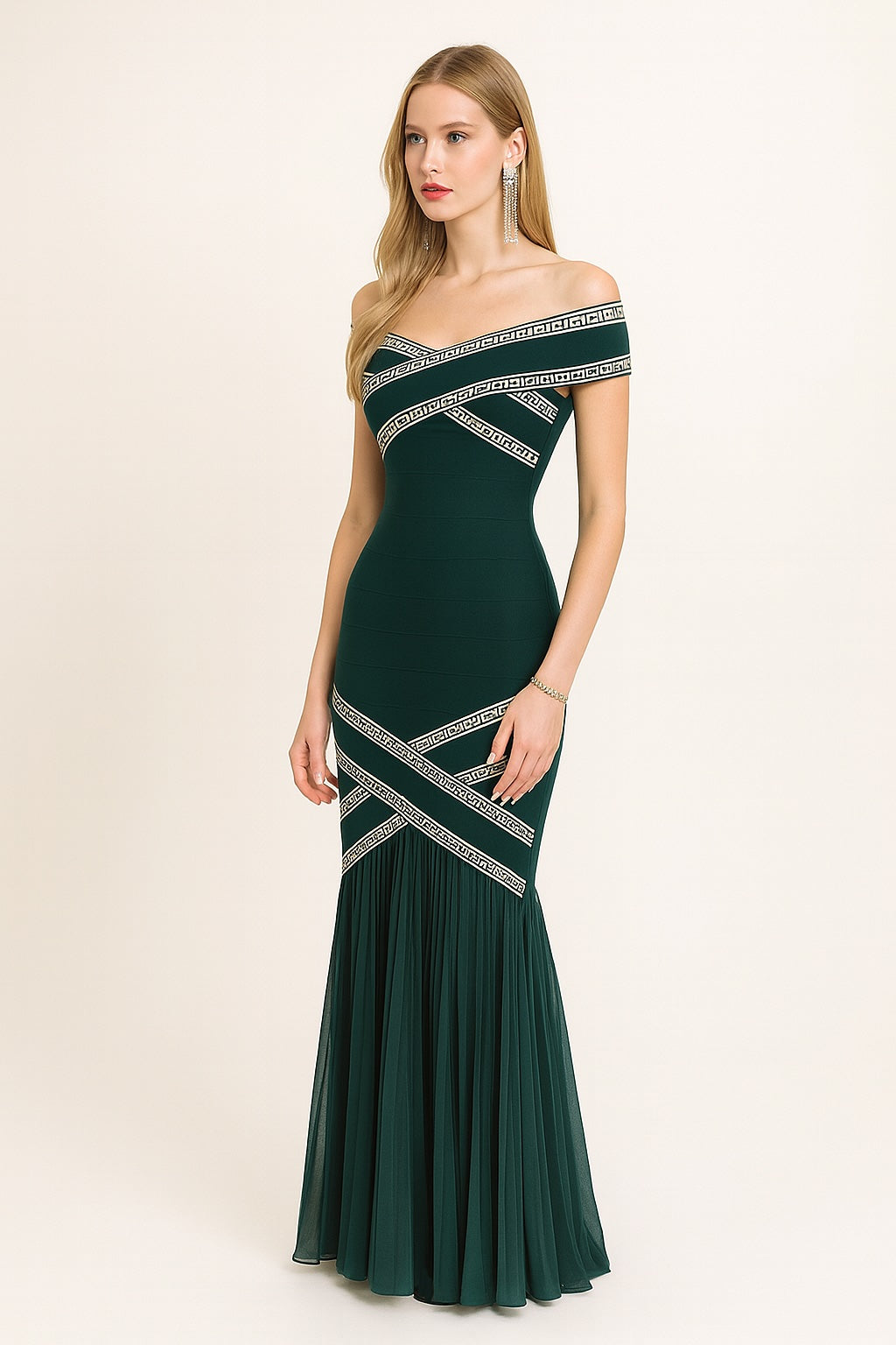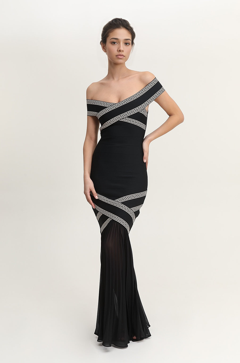 Robe bandage longue style sirène à épaules dénudées avec bandes croisées décoratives | Dressie Dress