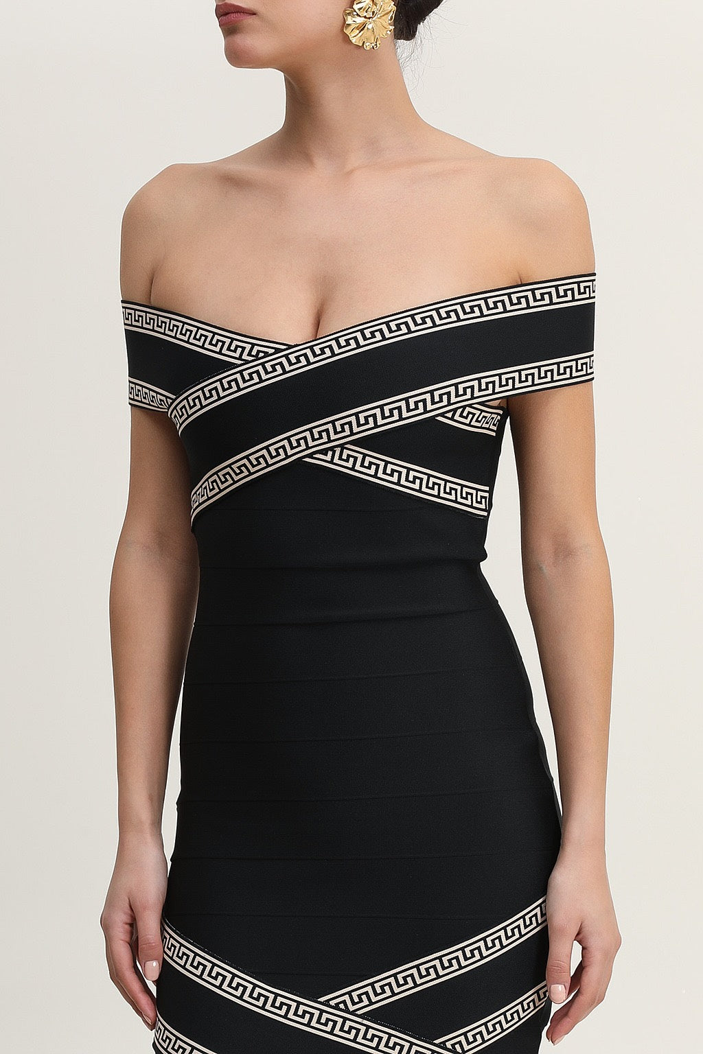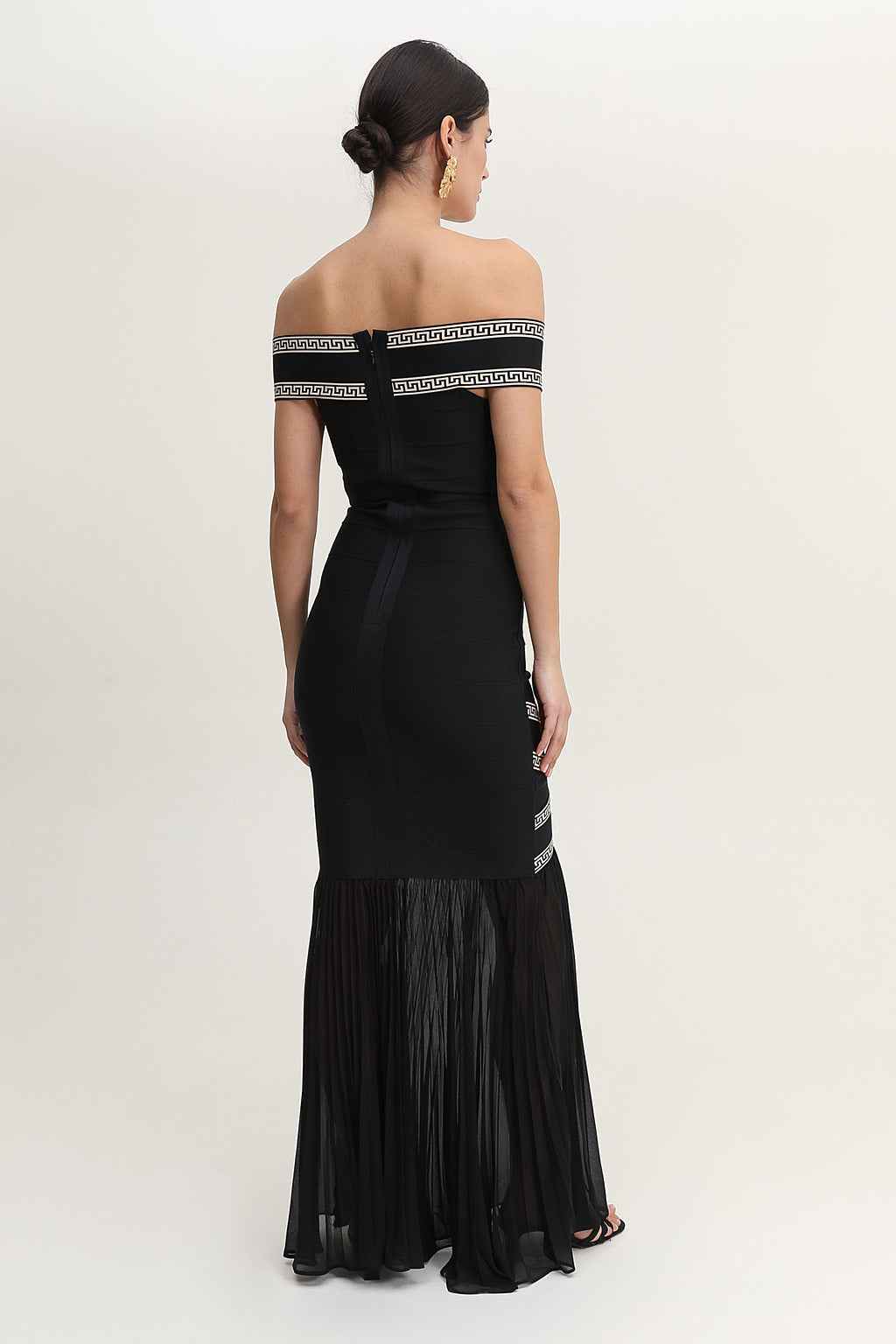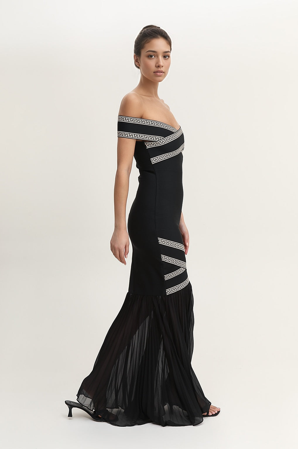 Robe bandage longue style sirène à épaules dénudées avec bandes croisées décoratives | Dressie Dress