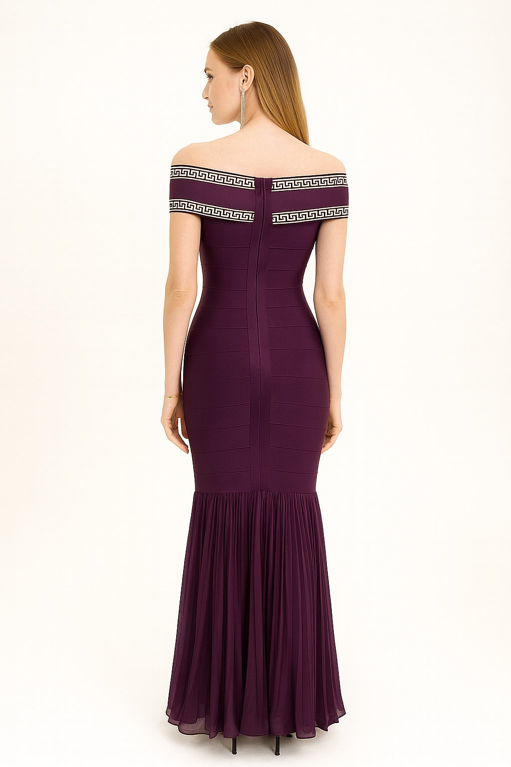 Robe bandage longue coupe sirène avec encolure Bardot croisée qui sublime les épaules. Le buste moulant gainant affine la taille tandis que le bas plissé façon queue de sirène crée un mouvement fluide. Un modèle sophistiqué idéal pour soirées, galas, mariages et grands événements.