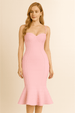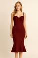 Robe bandage mi-longue moulante, décolleté cœur et fines bretelles, ourlet sirène à volants. Élégante et flatteuse pour soirées, cocktail et invité de mariage.