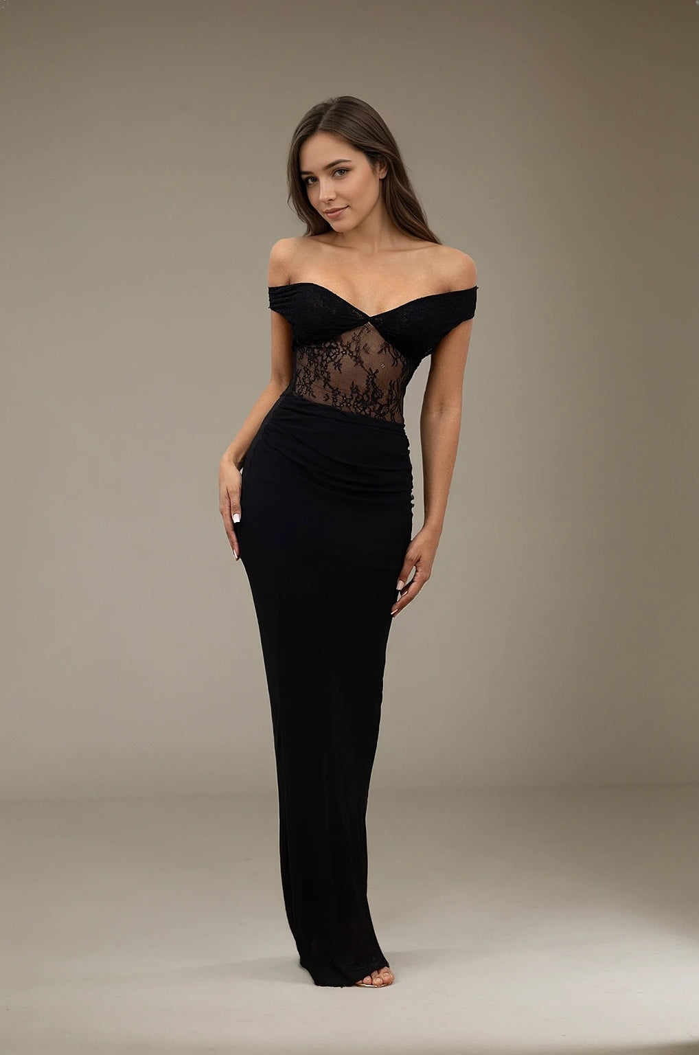 Robe longue épaules dénudées avec bustier en dentelle transparente et jupe fluide ajustée – Robes de fête | Dressie Dress