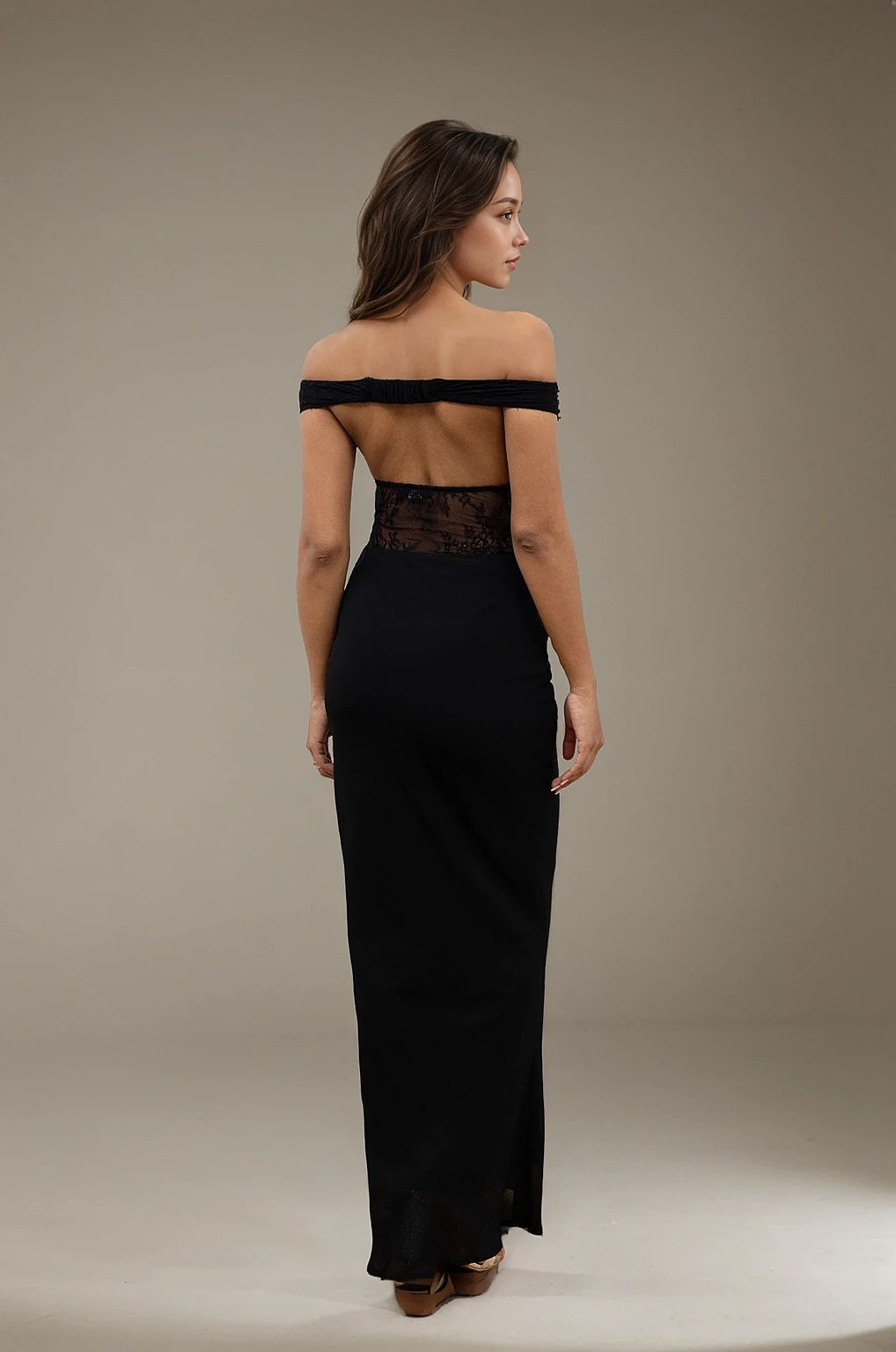 Cette robe longue Robes de fête & festivals mêle un décolleté épaules dénudées à un buste en dentelle transparente effet body, prolongé par une jupe fluide près du corps. Le résultat est à la fois romantique et sensuel, parfait pour soirées habillées, fêtes et événements spéciaux.