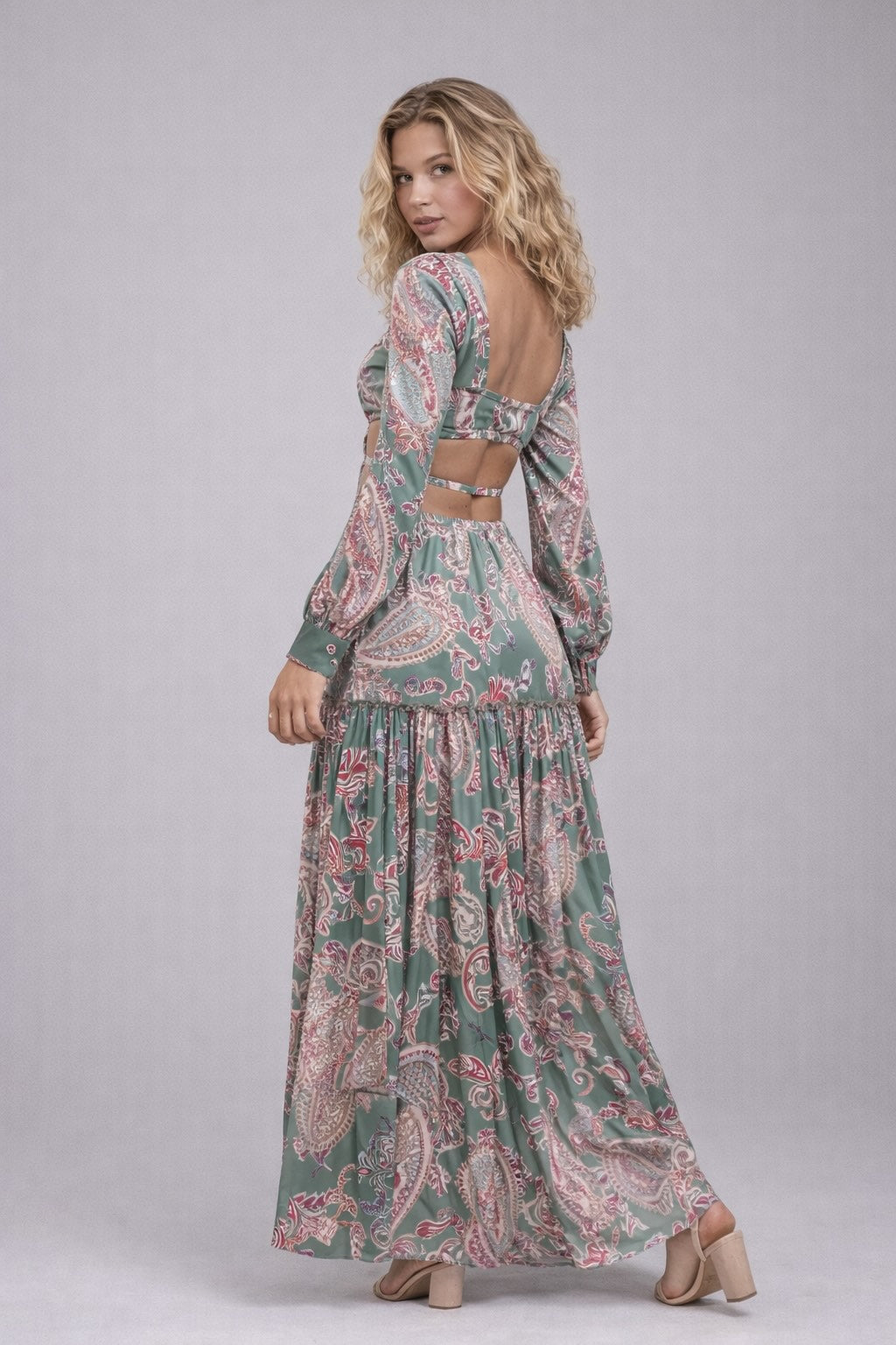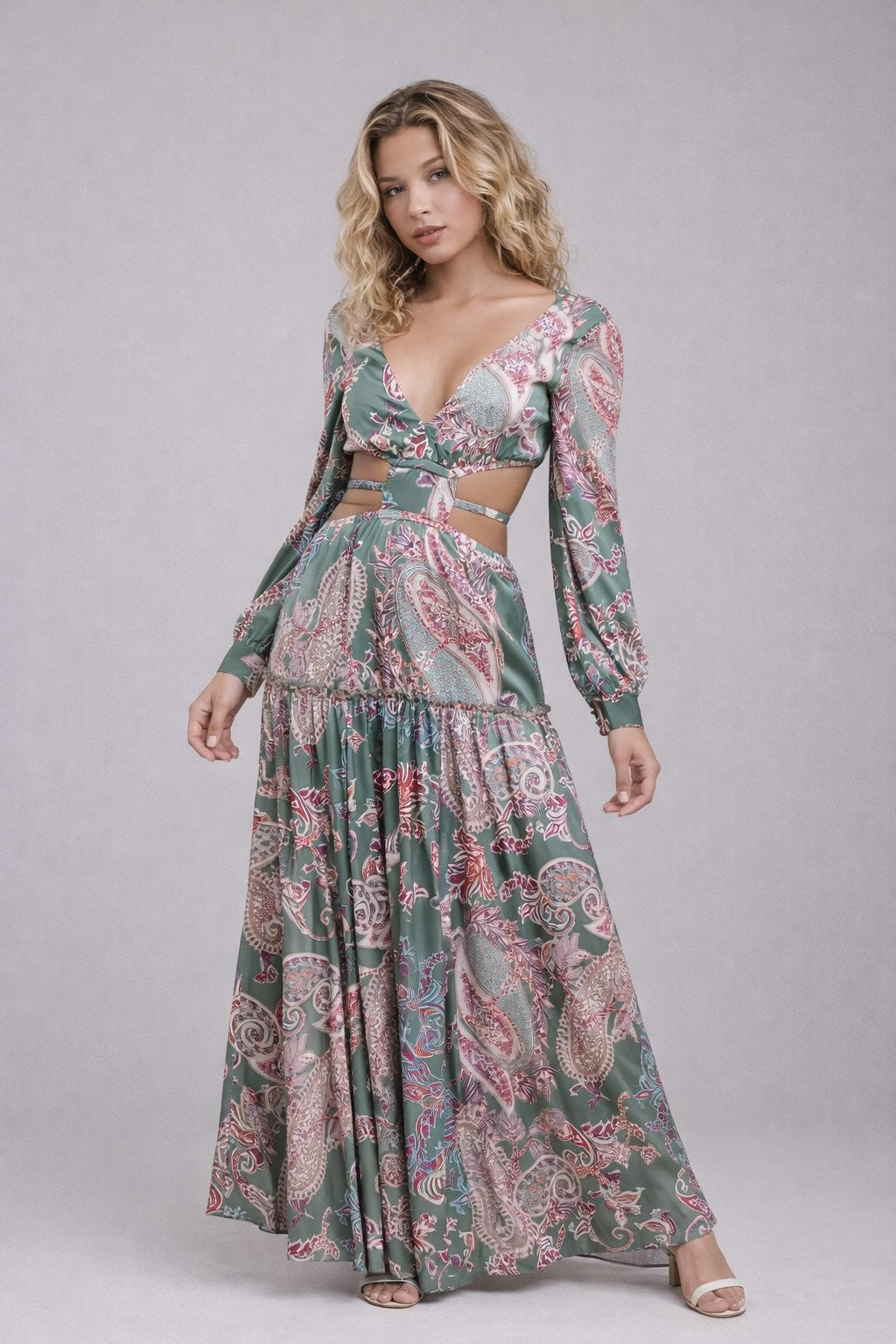 Robe longue imprimée à décolleté V plongeant découpes à la taille avec liens taille élastiquée manches longues et jupe à volants | Dressie Dress