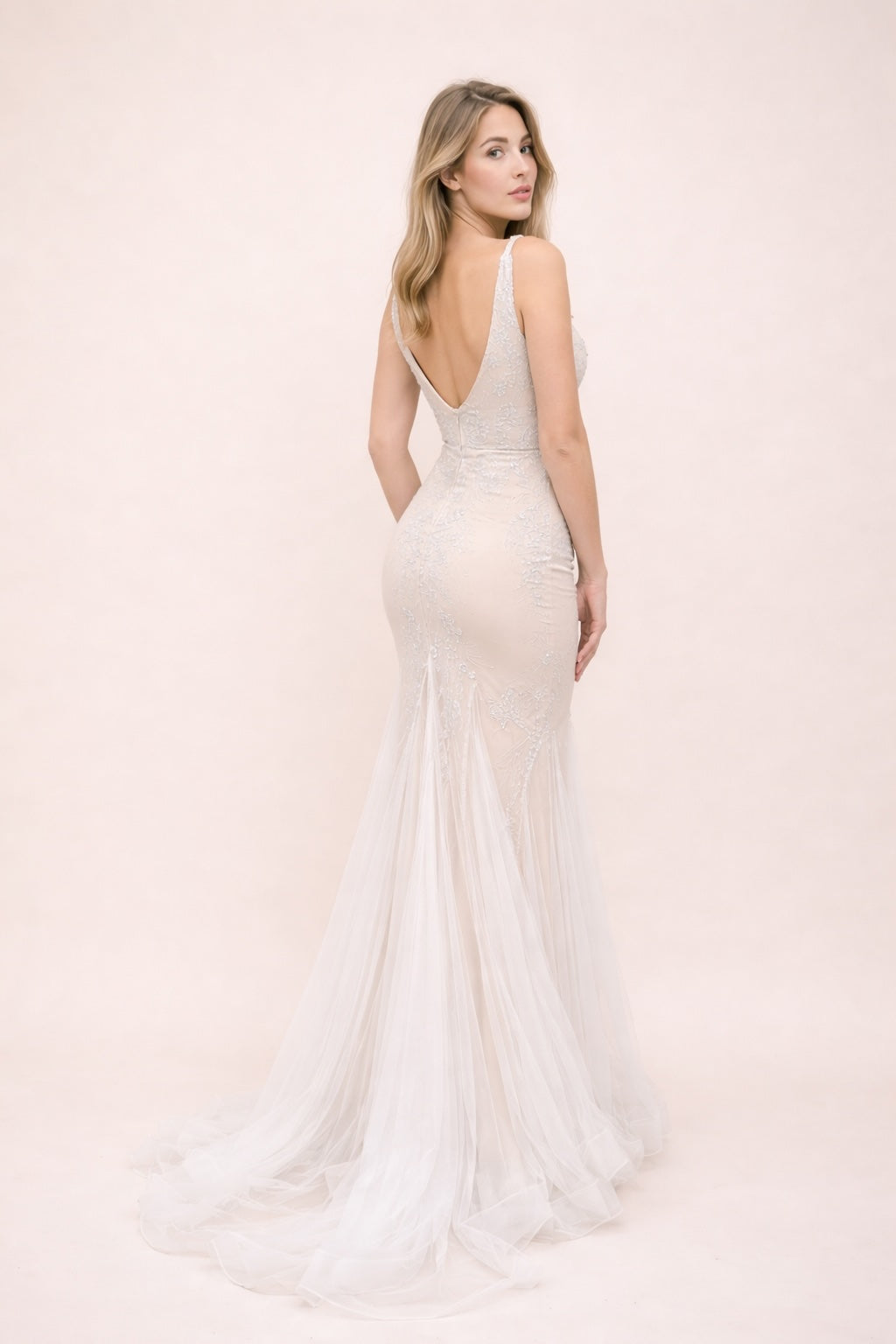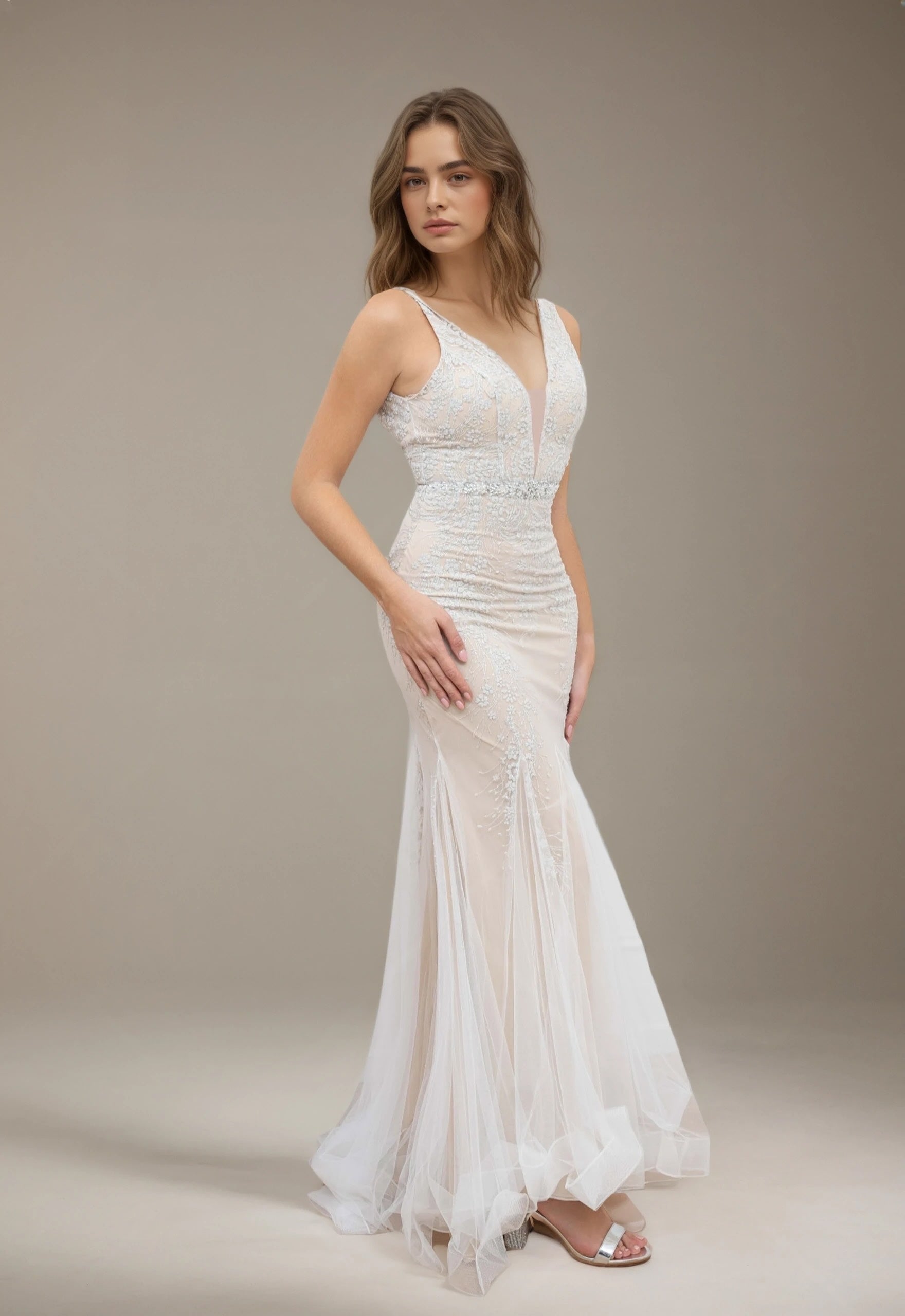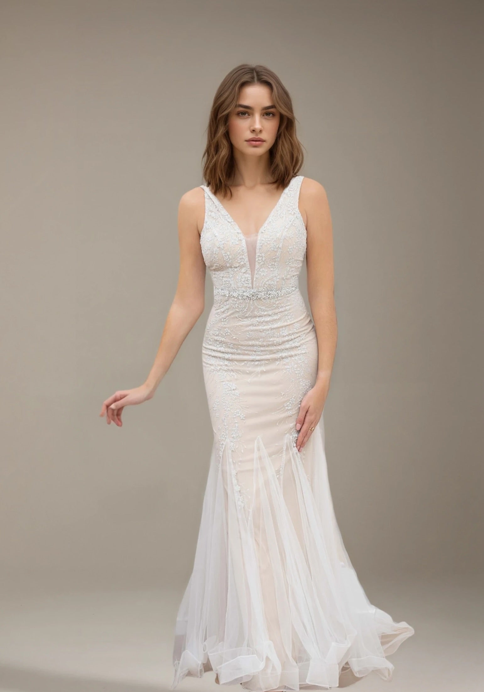 Cette Robes de mariage associe un décolleté V en tulle illusion à une base nude/champagne rehaussée de dentelle ivoire en relief. La taille perlée affine la silhouette, le dos en U dévoile élégamment le haut du dos, tandis que la coupe sirène et le tulle superposé créent une traîne légère et aérienne, idéale pour cérémonie, mairie, fiançailles et shooting.